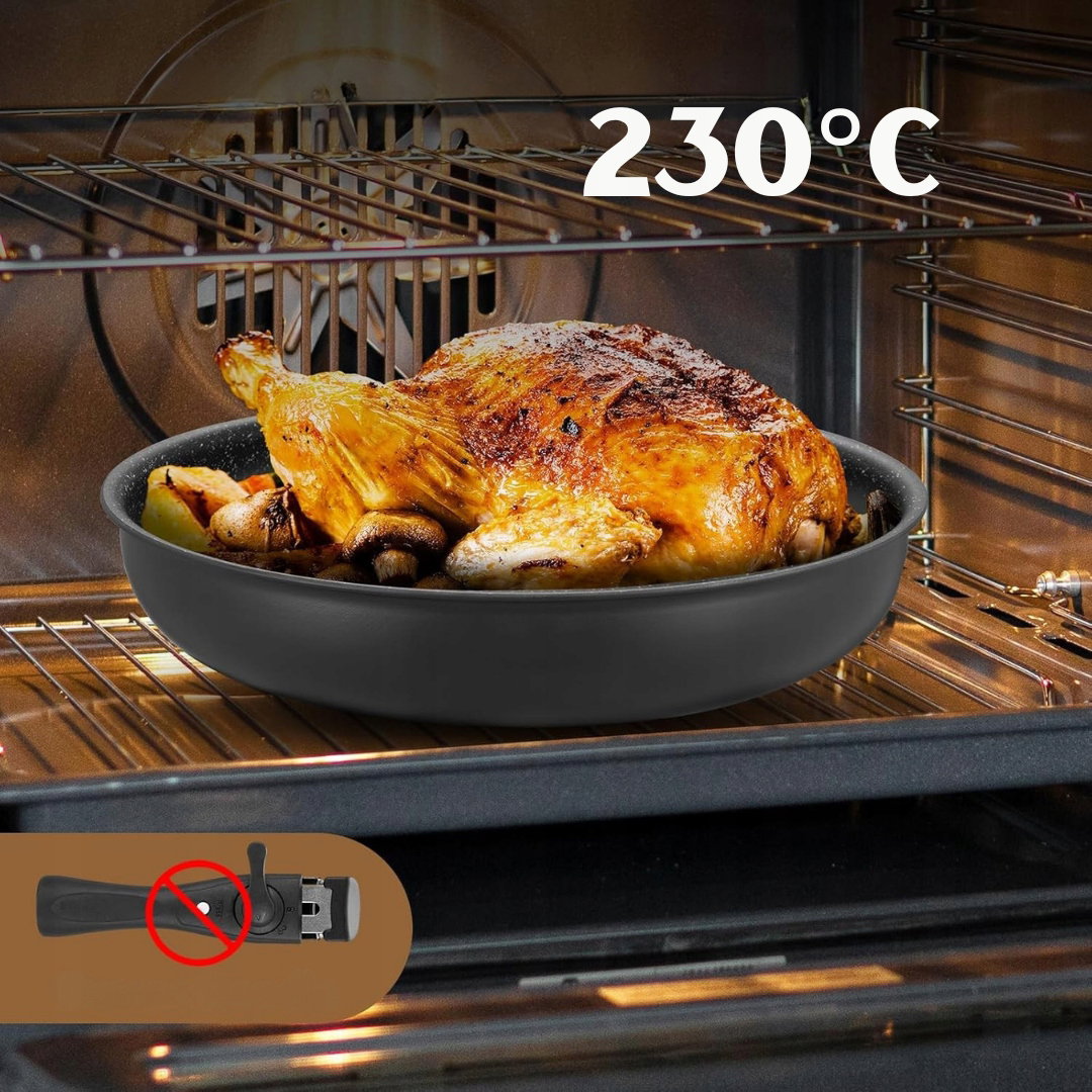 - Wszechstronne zastosowanie: zestaw umożliwia gotowanie na kuchence, pieczenie w piekarniku, grillowanie, a nawet podgrzewanie w mikrofalówce. Dzięki odłączanemu uchwytowi zyskujesz nieograniczone możliwości kulinarne – idealne rozwiązanie do codziennego gotowania i nowoczesnej kuchni.