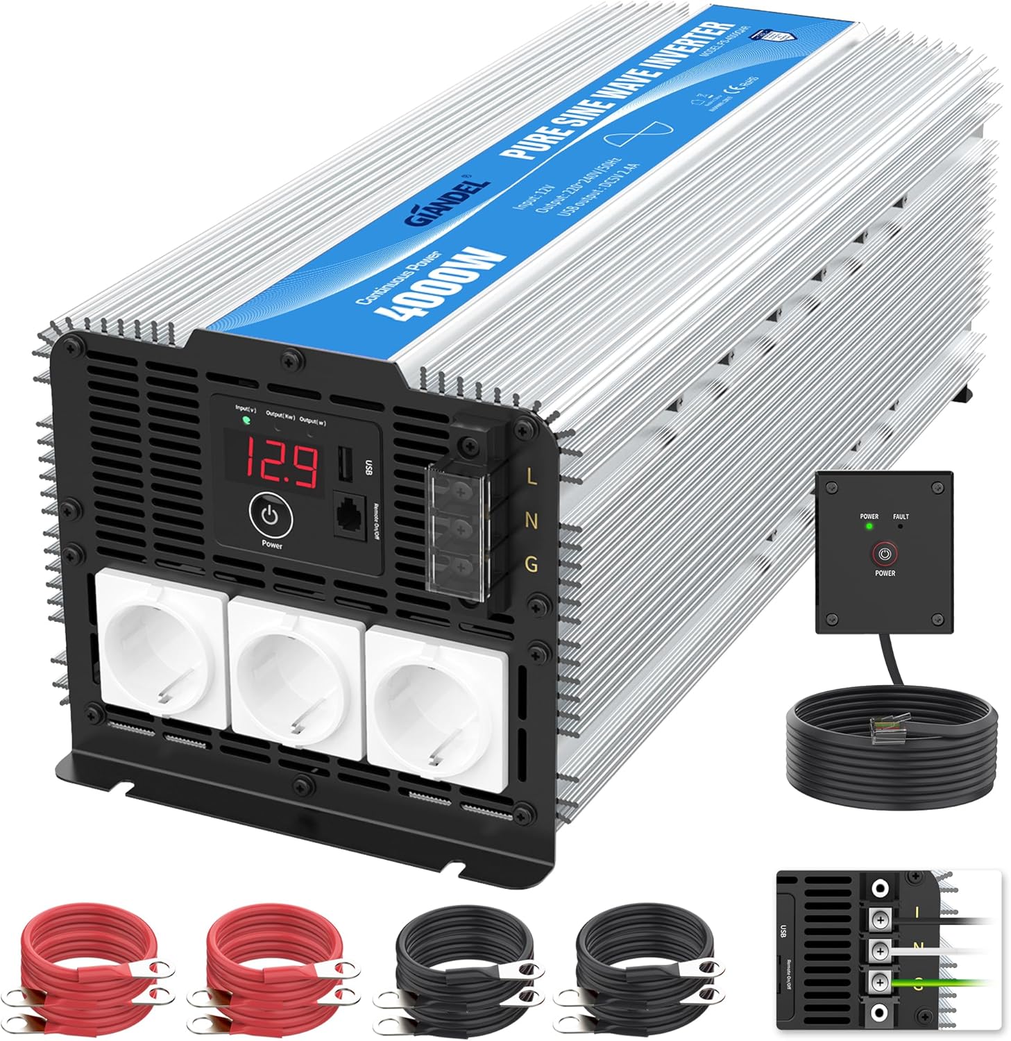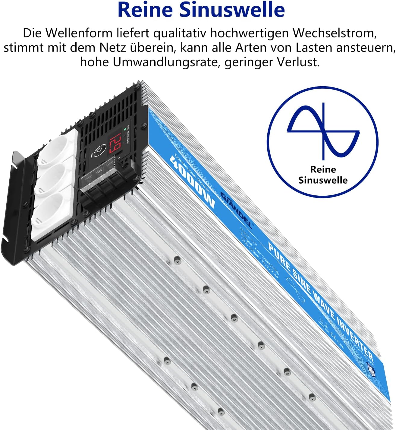Falownik Giandel o mocy 2000 W zapewnia ciągłą moc 2000 W, moc szczytową 4000 W, dwa gniazda AC i 1 port USB 2,4 A.