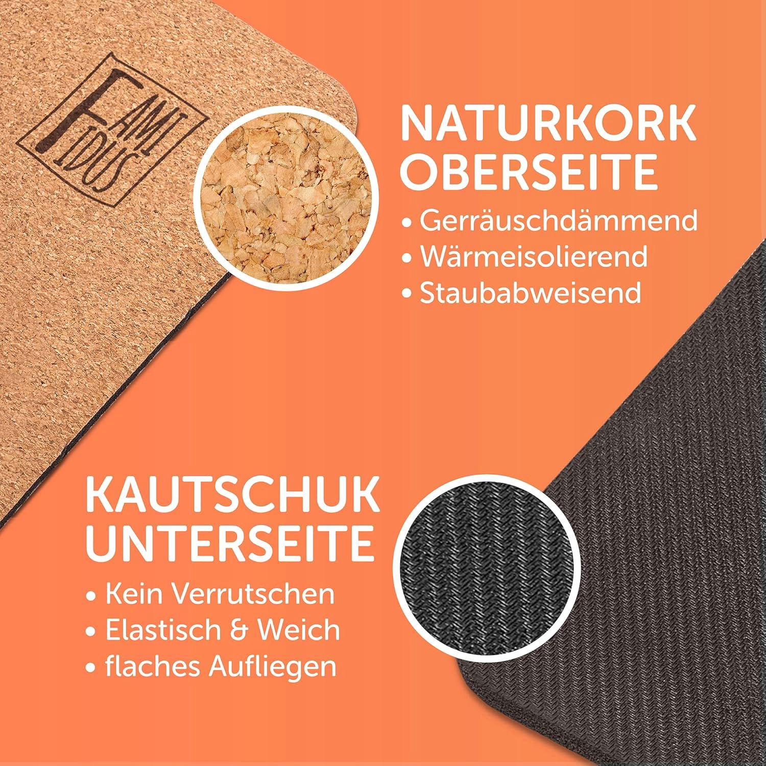 Matowa, całkowicie antypoślizgowa – mata korkowa pozostaje tam, gdzie powinna leżeć. Dzięki temu dzieci mogą się na nim bawić i podskakiwać bez ześlizgiwania się maty. Mata pewnie leży na podłodze, nie marszcząc się i nie zsuwa się. Idealny jako dywan do zabawy!