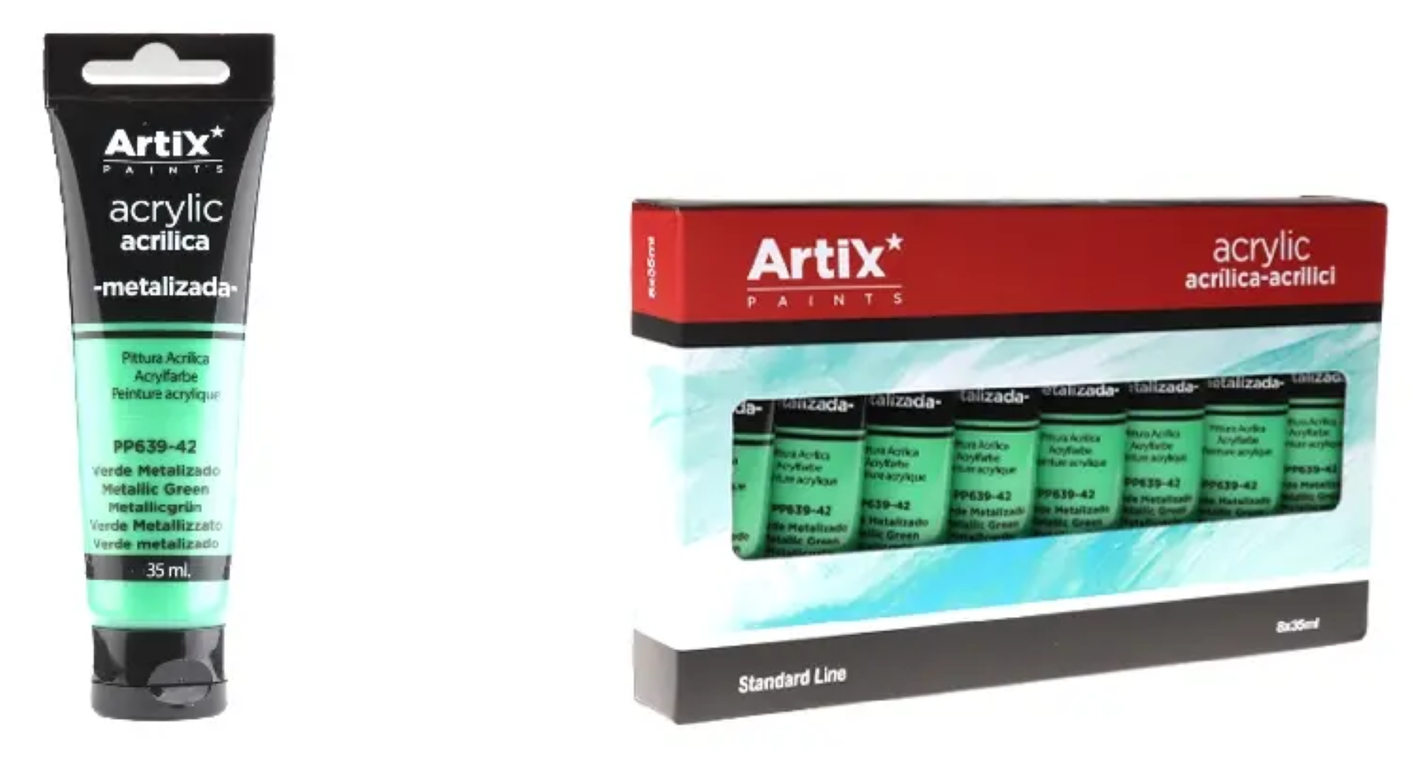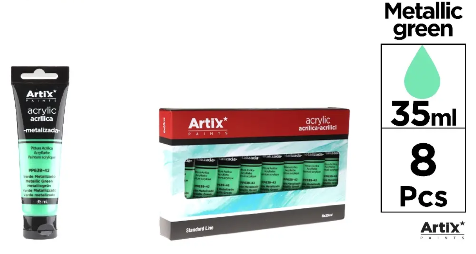 Satynowa farba akrylowa o dużej gęstości z błyszczącymi pigmentami zawartymi w akrylowej emulsji polimerowej, dzięki czemu idealnie nadaje się do tworzenia rzeczywistych i spójnych tonów podczas malowania.