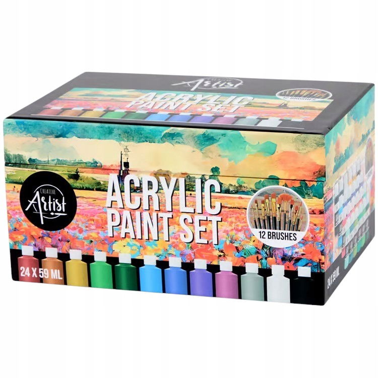 Farby Akrylowe Creative Artist mix kolorów duży box 24 x 59 ml + 12 pędzli