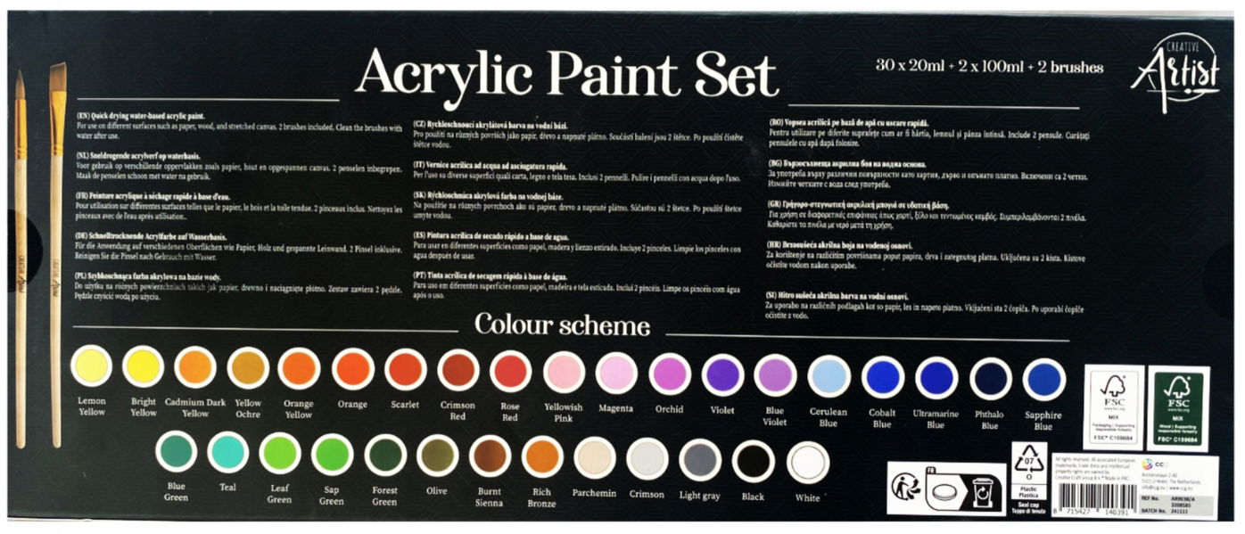 Farby Akrylowe Kolorowe Acrylic 30 x 20ml 2 x 100ml + 2 pędzle duży zestaw
