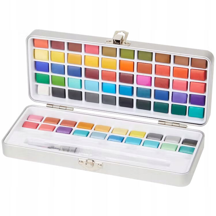 Każda kostka akwareli ma w nim swoje miejsce. 20 kolorów metalicznych jest oddzielone od reszty i znajduje się w kasetce po stronie z pędzelkiem.