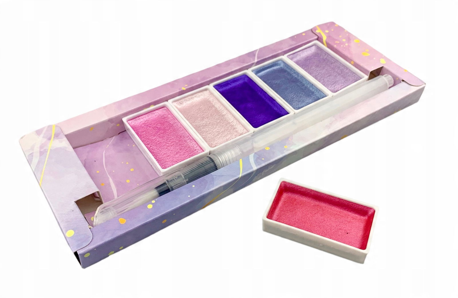 Zestaw metalicznych suchych farb akwarelowych w wodnym pędzelkiem w zestawie.