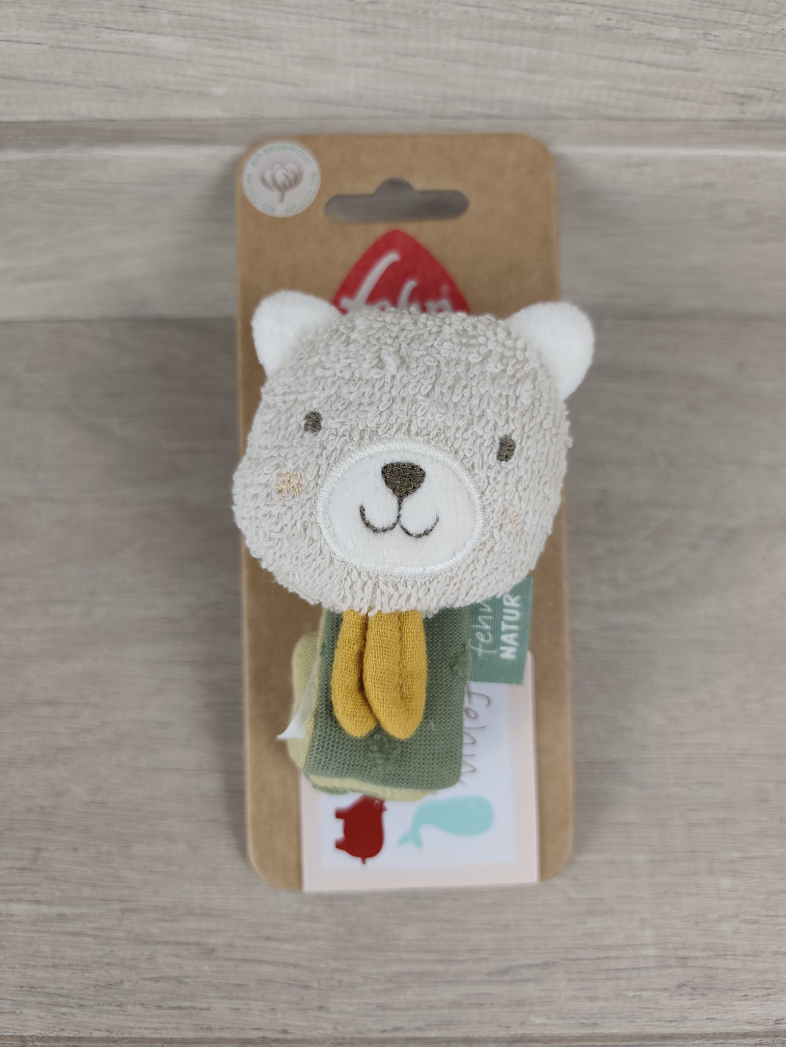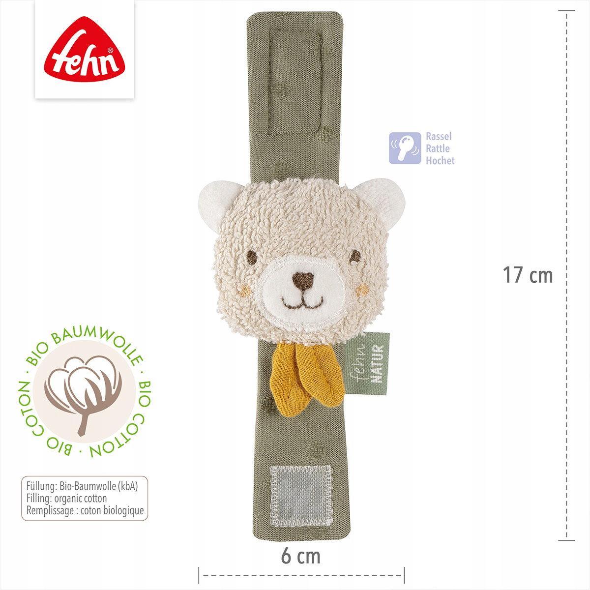 🤎 Fehn NATUR Miś Grzechotka na rączkę bio-bawełna 0+ 17 cm to mięciutka, lekka i bezpieczna grzechotka‑opaska na rączkę wykonana z bio‑bawełny (kbA). Idealna już od pierwszych dni życia, zachęca malucha do poruszania rączkami, chwytania i odkrywania dźwięków.
