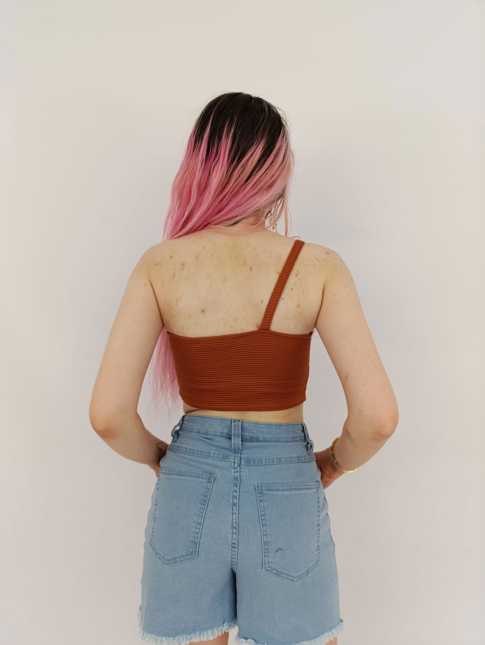 Nowoczesna bluzka damska marki Femme Luxe idealna na lato. Tłoczona, jednoramienna crop top, który podkreśli Twoją stylizację. Modny must-have na nadchodzący sezon!