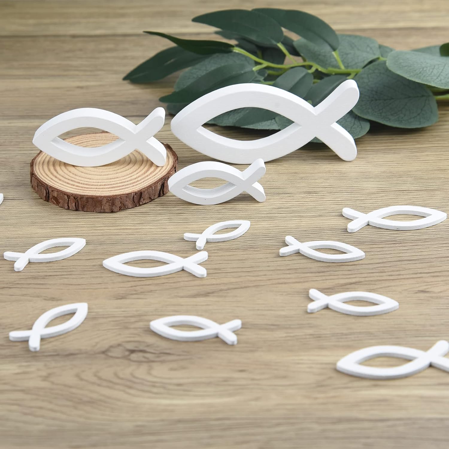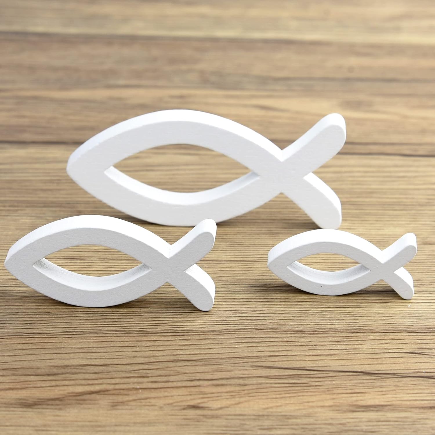 🐟 Zestaw 6 Drewnianych Ryb – Biała Dekoracja Stołu (Chrzest, Komunia)