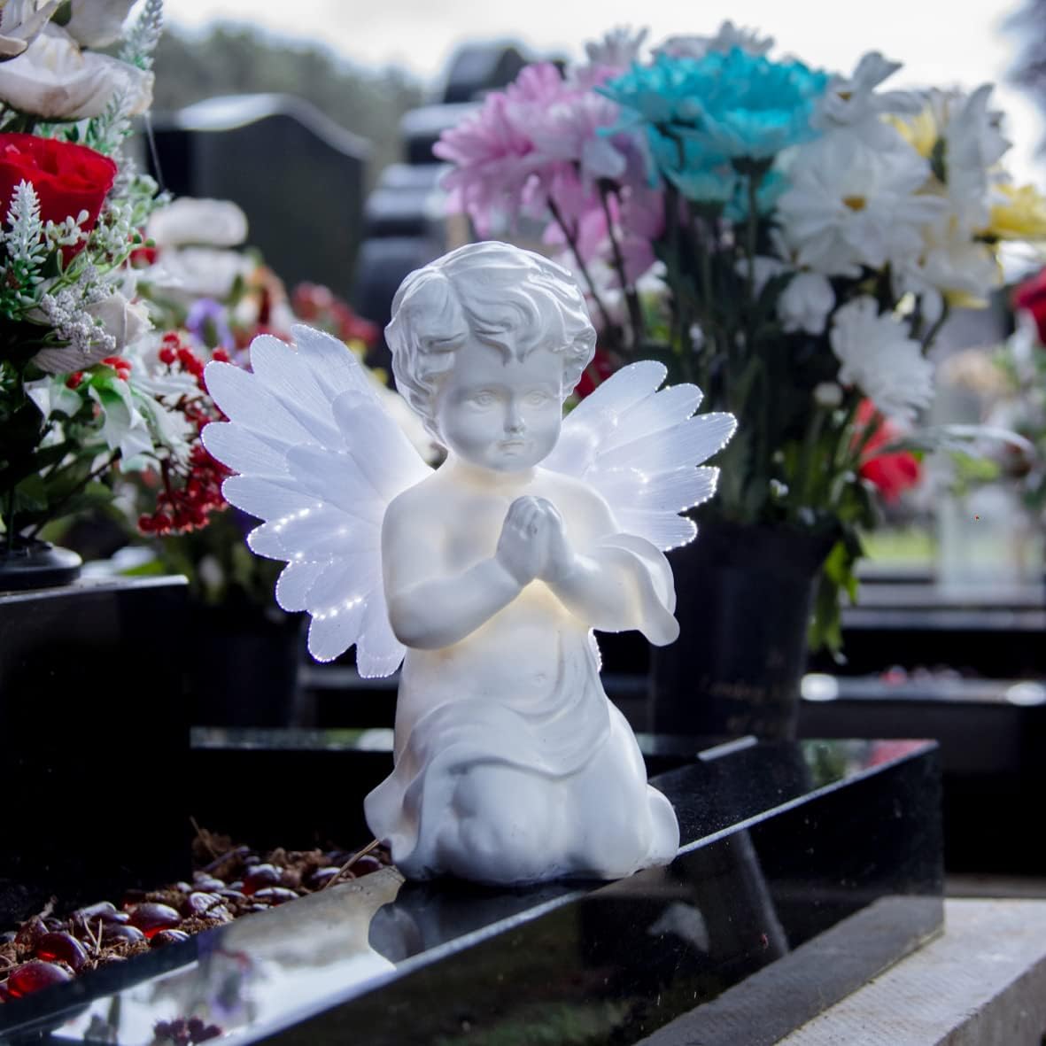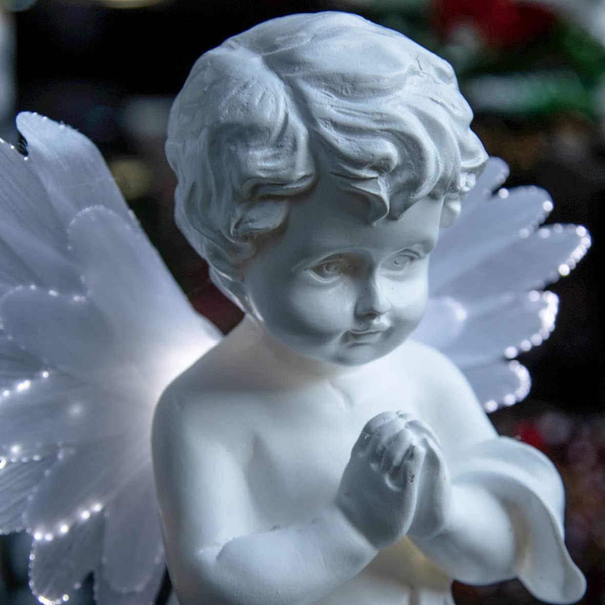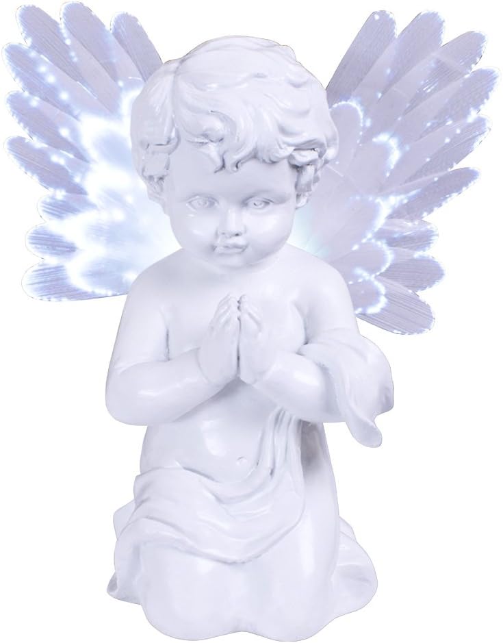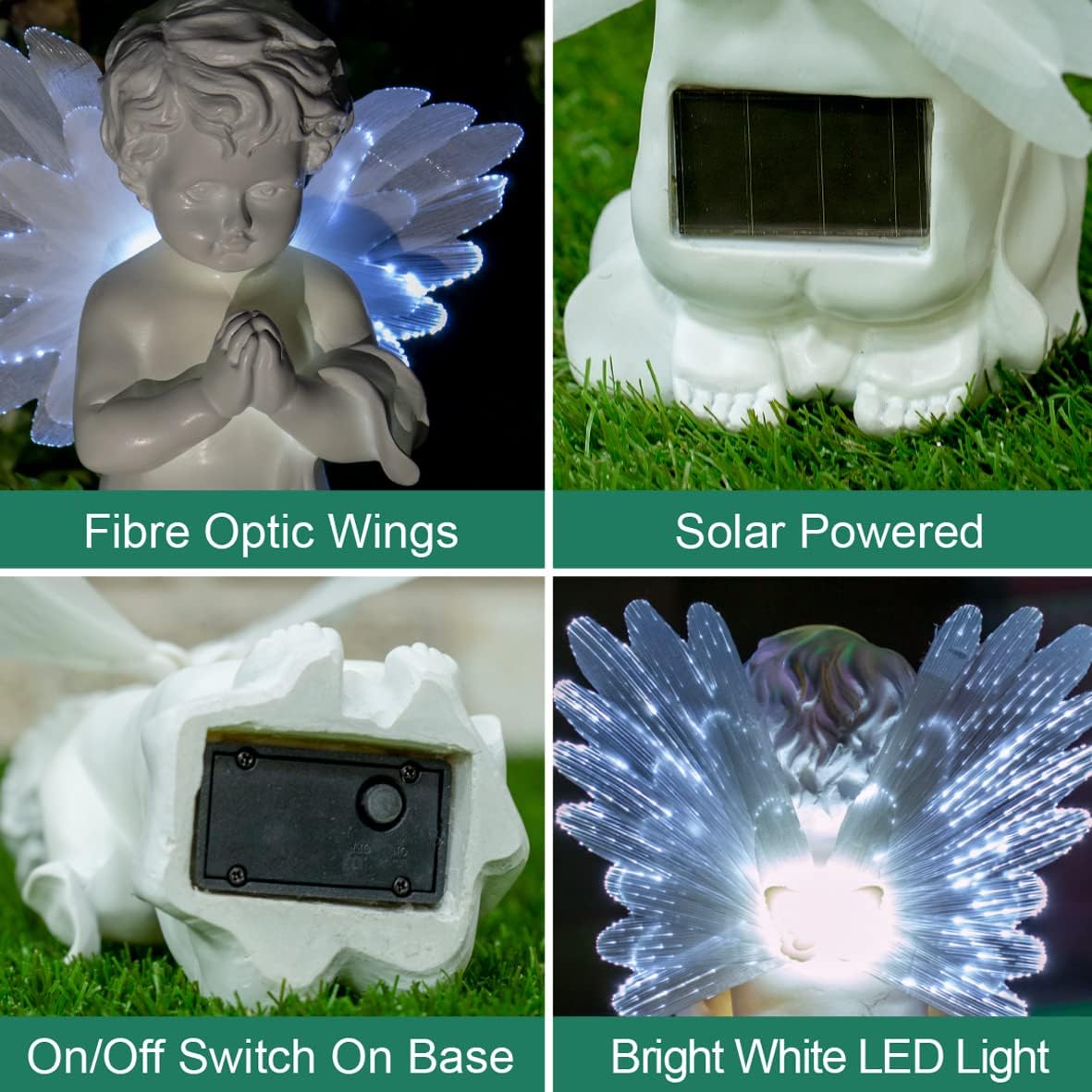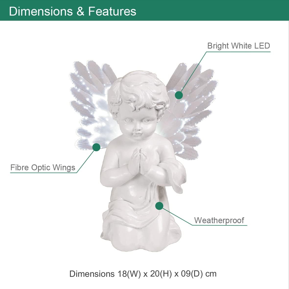 Zasilany energią słoneczną – ten spokojny anioł ma korpus zasilany energią słoneczną i przekształca naturalne światło słoneczne dnia za pomocą panelu słonecznego z tyłu. O zmierzchu przekształca się w klasyczne ciepłe białe oświetlenie wraz z dodatkowym światłem ze skrzydeł światłowodowych.