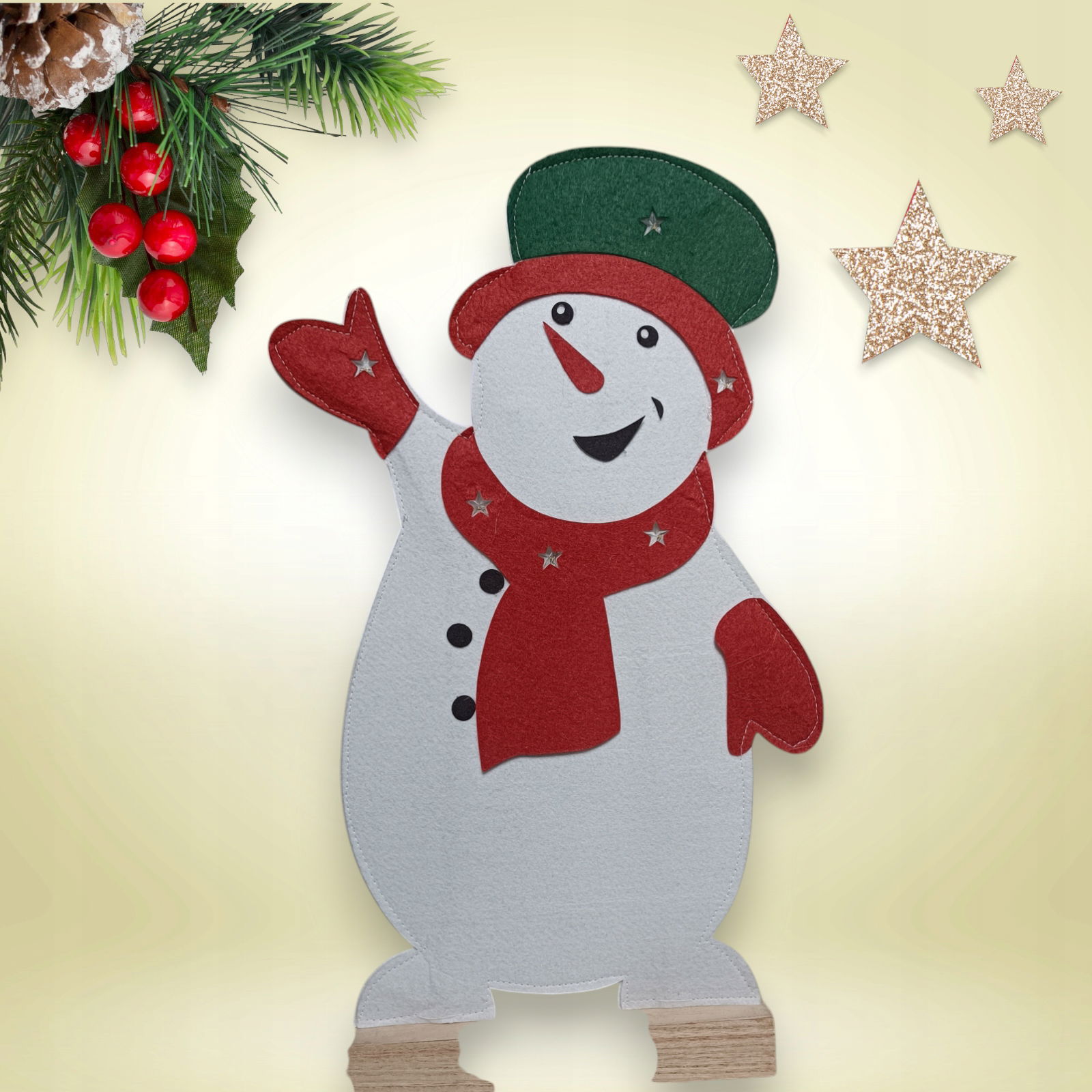 Figurka BAŁWAN Dekoracja z filcu Led ozdoba drewaniana podstawa 45cm