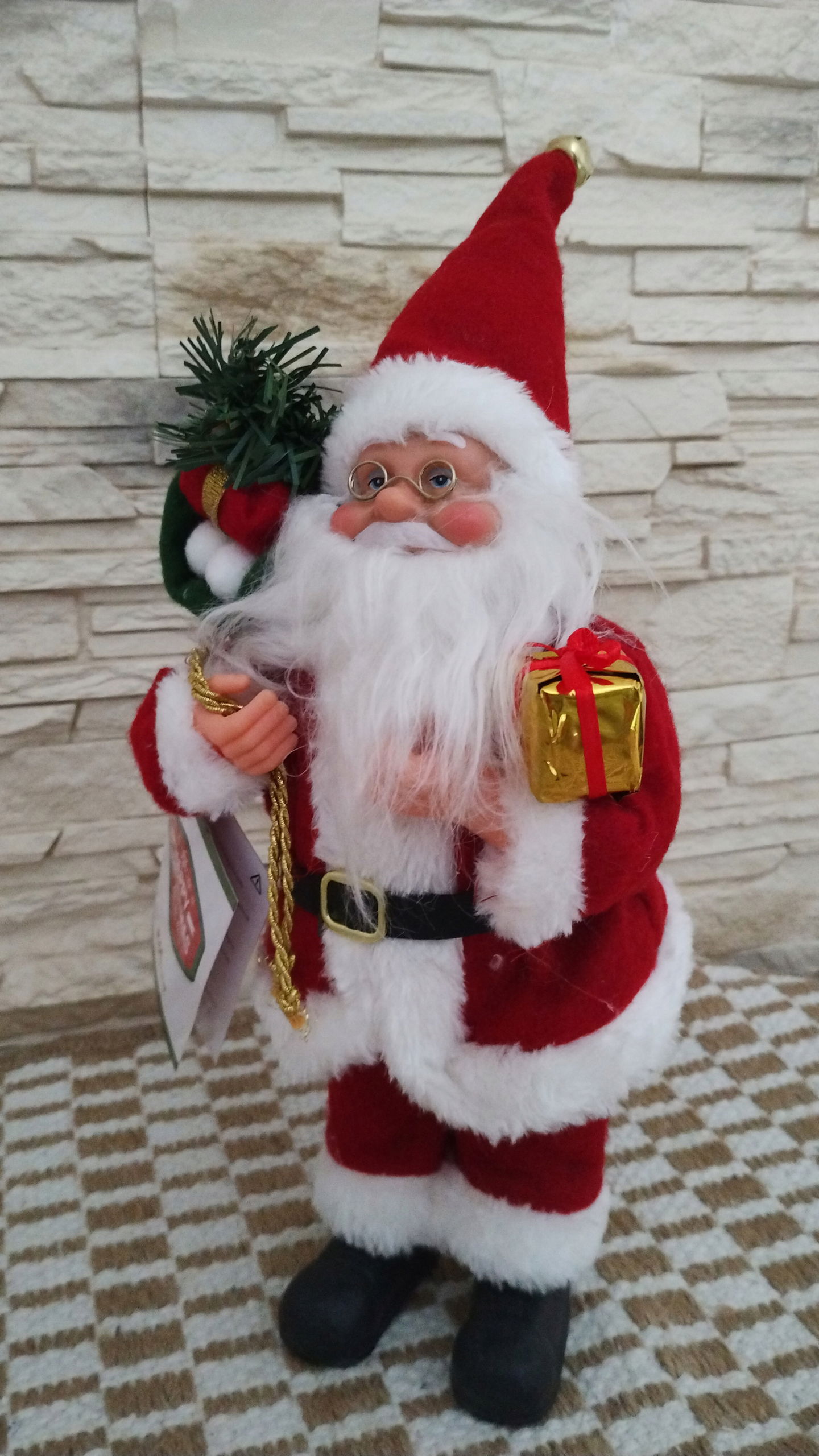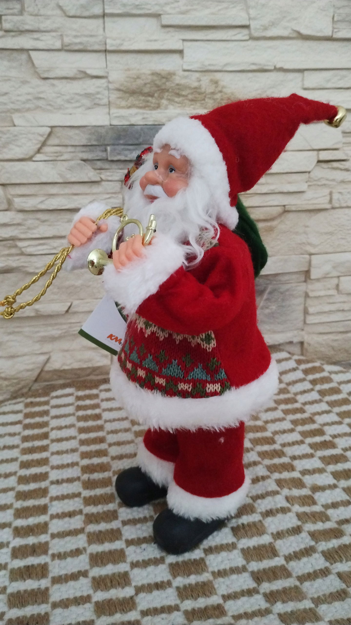 Mikołaj z workiem wypełnionym prezentami , czerwono szarym kubraku i dzwoneczkiem.