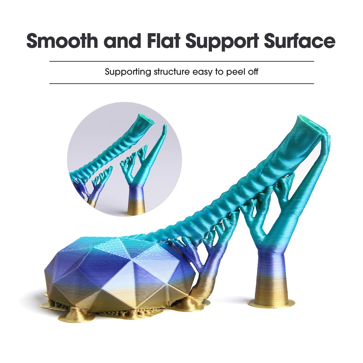 Łatwy druk: eSUN Silk Rainbow Pla pozwala na drukowanie modeli o gładkiej i płaskiej powierzchni; podkład jest łatwiejszy do odklejenia od powierzchni modelu niż inne materiały. Ponadto jest odporny na pękanie dzięki wysokiej wytrzymałości, niskiemu skurczowi i braku odkształceń.