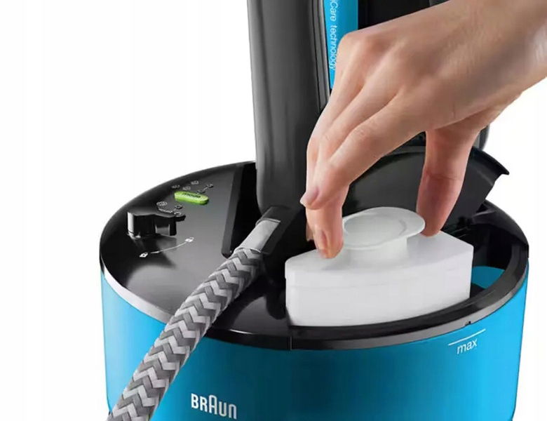 Filtr BRAUN BRSF 001 skutecznie usuwa wapń z wody używanej w żelazku, co znacząco zmniejsza ryzyko osadzania się kamienia w systemie parowym.