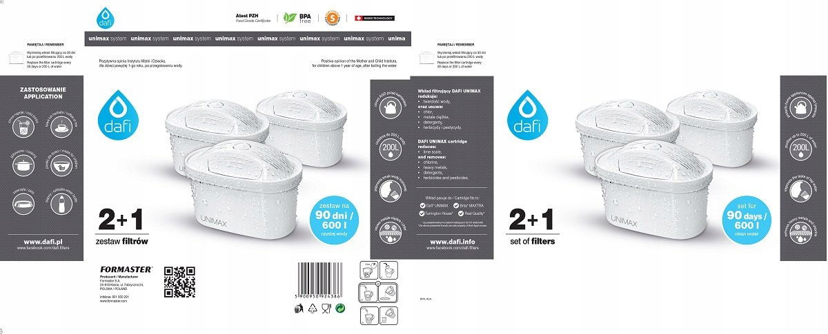 Cechy filtru : filtruje i jednocześnie wzbogaca wodę w życiodajnymagnez pokrywa ponad 20% dziennego zapotrzebowania dorosłego człowieka na ten pierwiastek ponadto spełnia podstawową funkcję wszystkich filtrów Dafi - redukuje zawartość metali ciężkich, usuwa większość substancji niekorzystnie wpływających na smak, zapach i barwę wody został stworzony z myślą o osobach, które chcą polepszyć jakości wody kranowej i sprawić, że stanie się ona idealna do picia woda przefiltrowana filtrem Magnezowym Mg+ jest najlepszą alternatywą wody butelkowanej magnez sprawia, że woda smakuje lepiej i jest zdrowsza