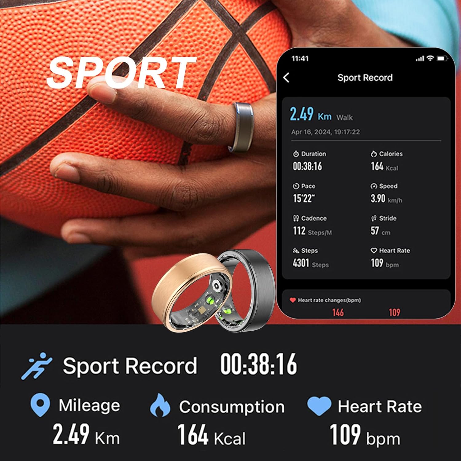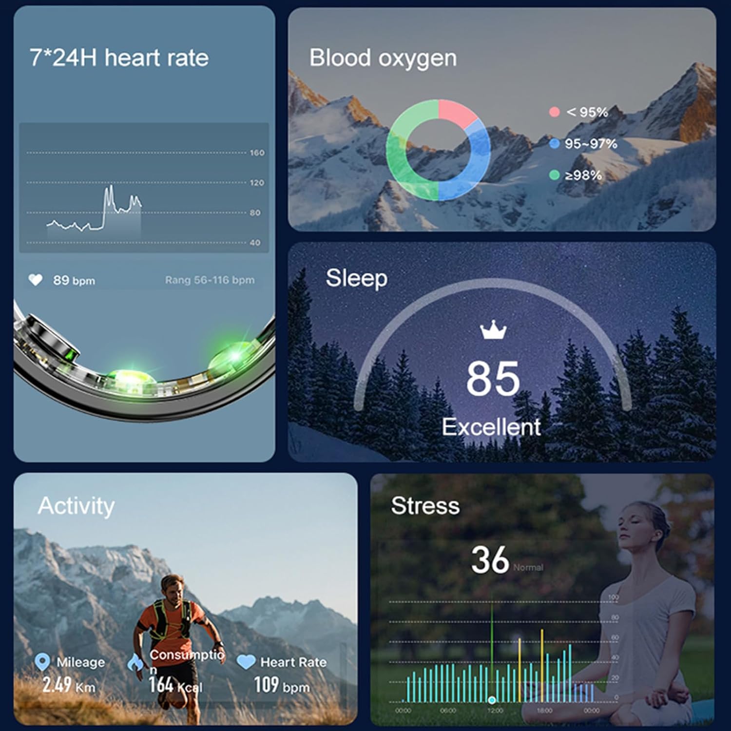 Pierścień monitoruje sen, liczy spalone kalorie, rejestruje pokonany dystans oraz liczbę kroków. Dzięki wbudowanym czujnikom umożliwia stałe śledzenie aktywności i pomaga kontrolować postępy treningowe oraz codzienny ruch. Dane synchronizują się z aplikacją mobilną, gdzie można analizować szczegółowe statystyki i historię pomiarów.
