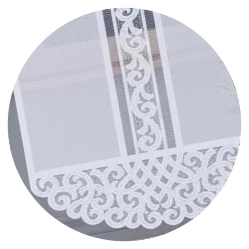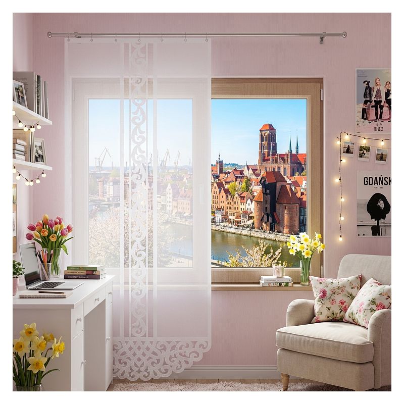 Gotowa firana panelowa oferowana jest w zawsze modnym kolorze białym. Ponadczasowa biała kolorystyka dekoracji podkreśli miły dla oka wystrój Twojego okna.
