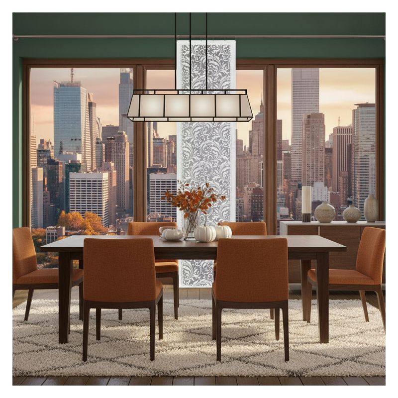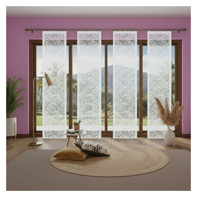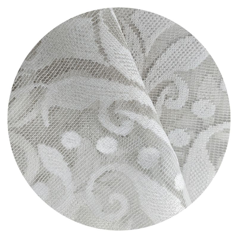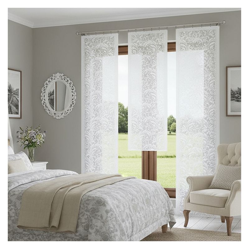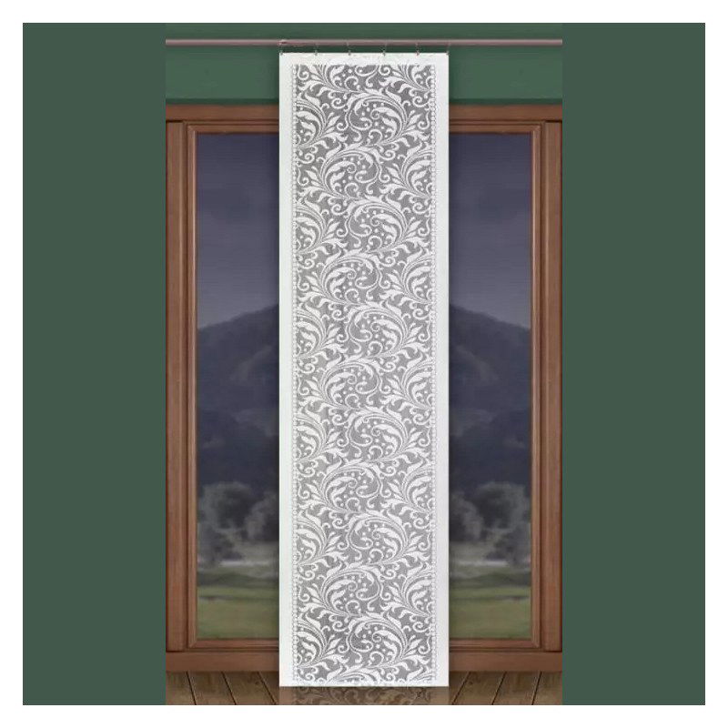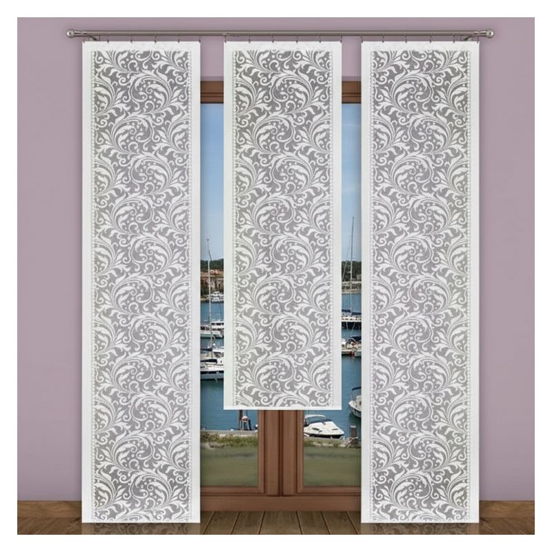 Panelowa firanka upiększona jest klasycznym, eleganckim wzorem zdobniczym.