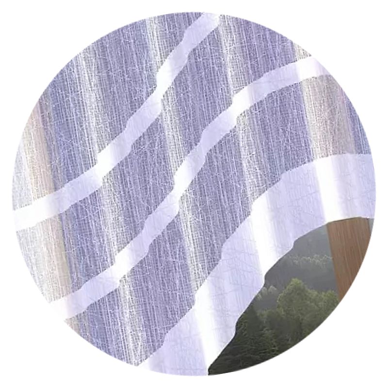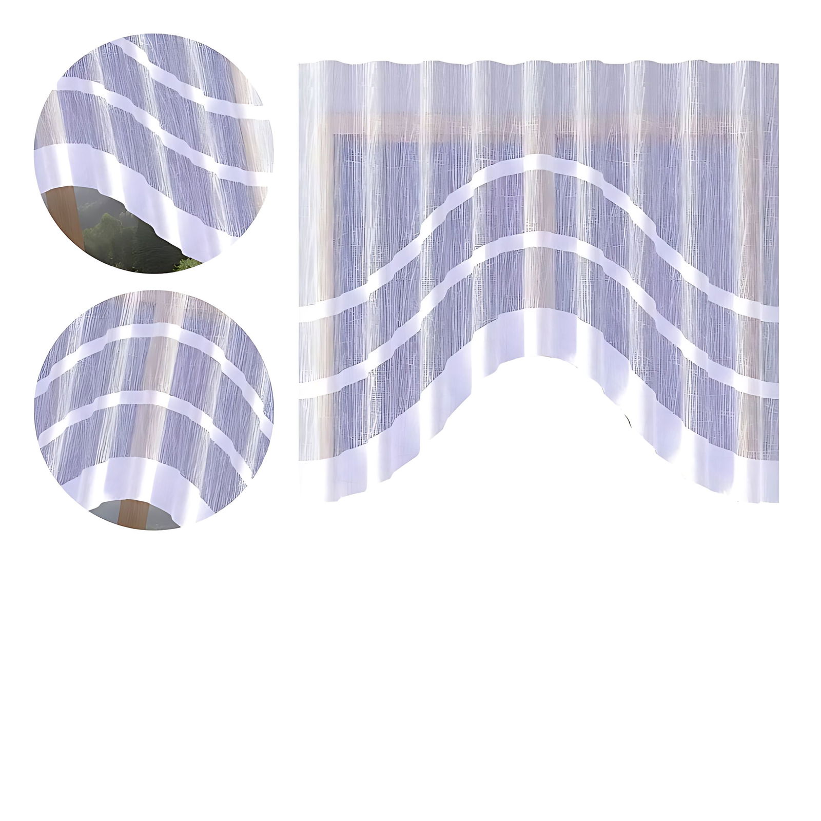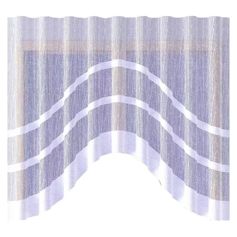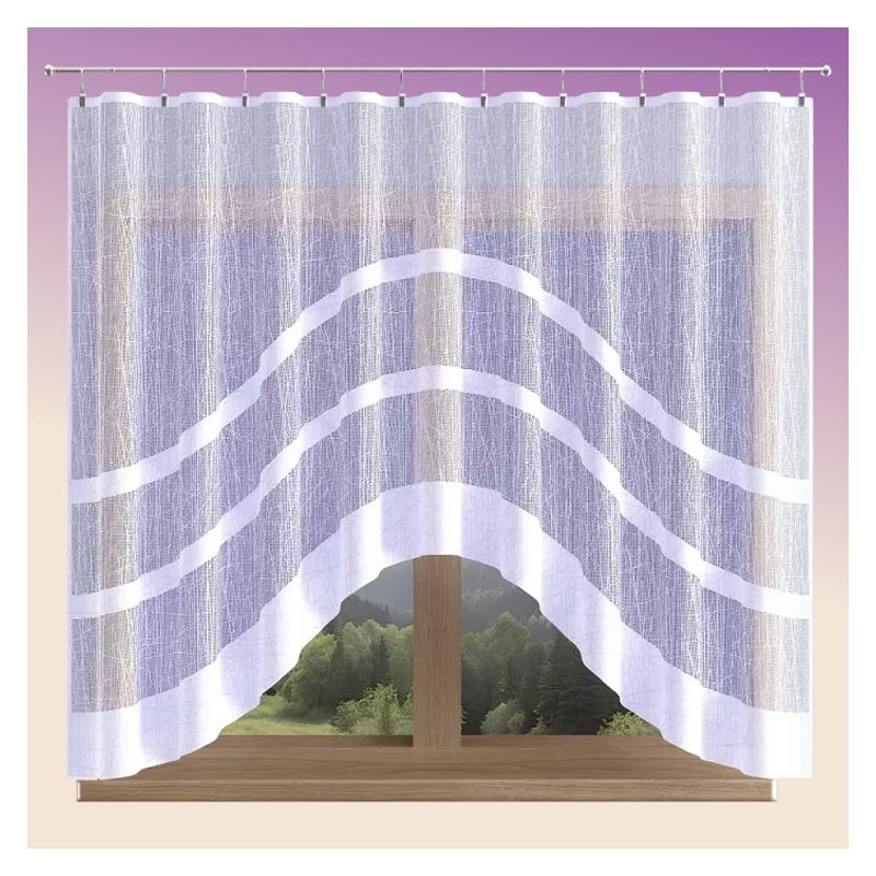 Biała firana Bakar upiększona jest modnymi pasami i wykończona w dolnej części finezyjnym łukiem.
