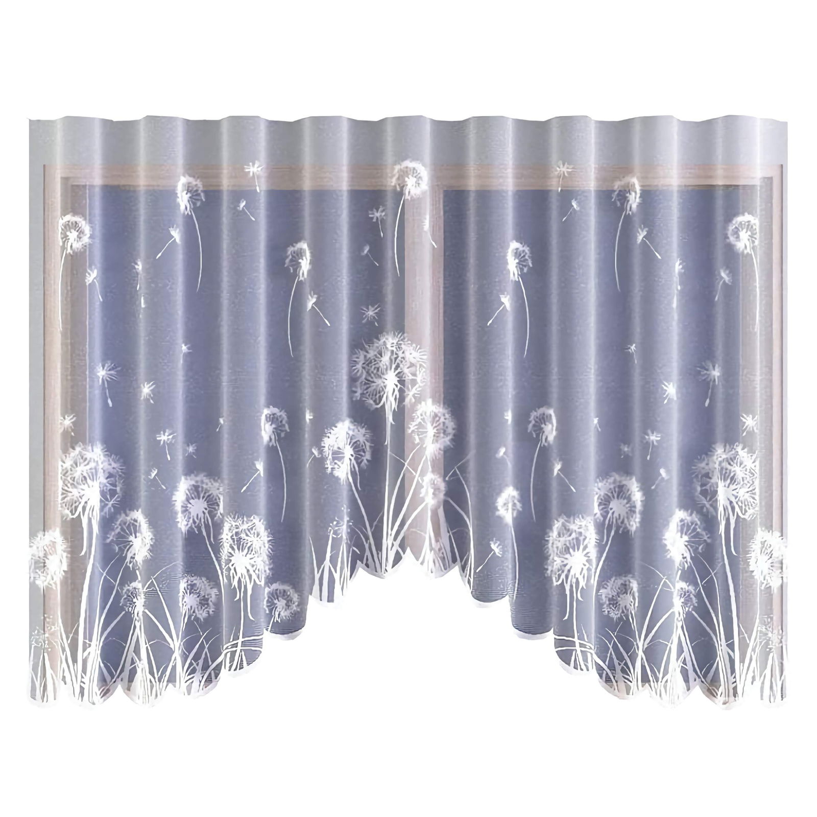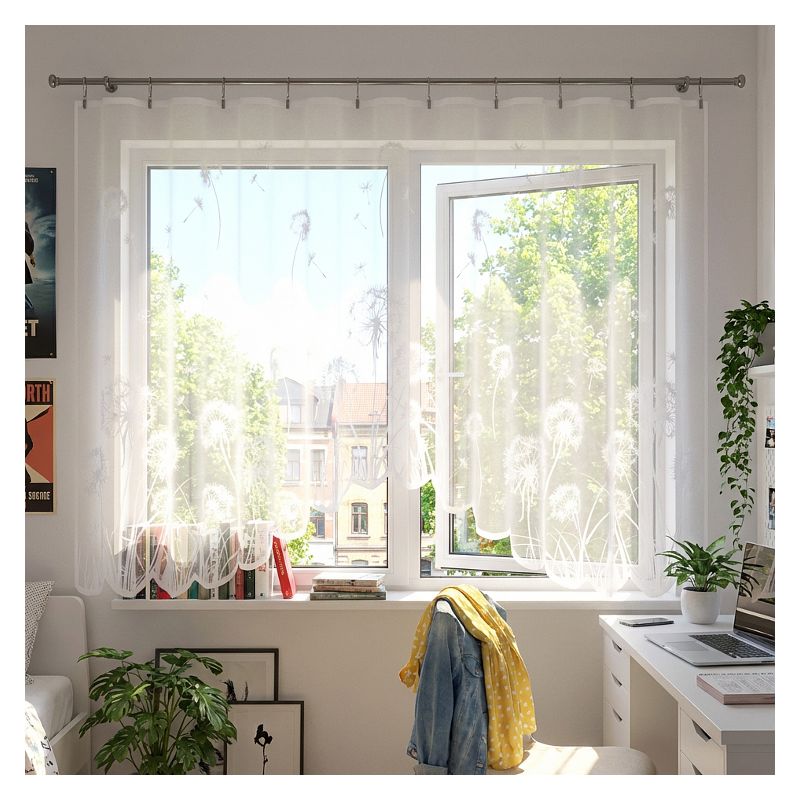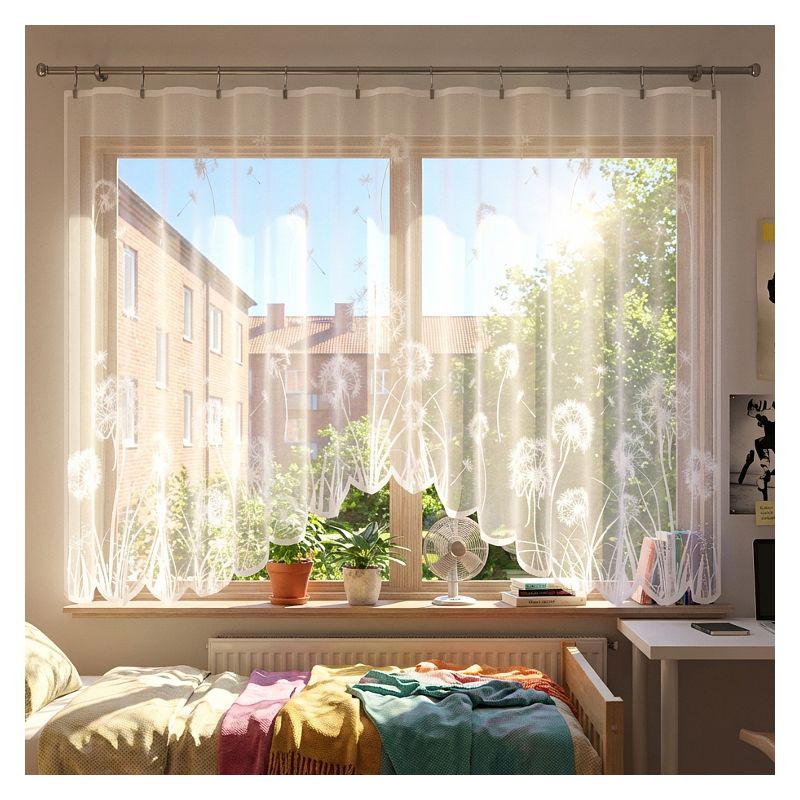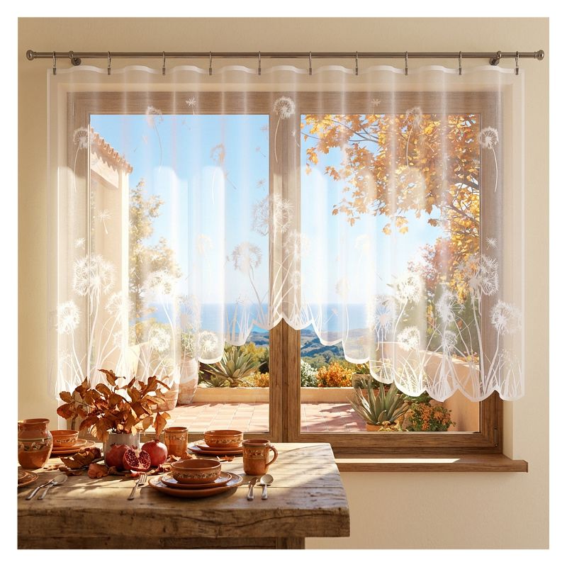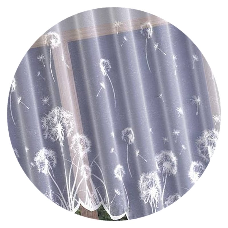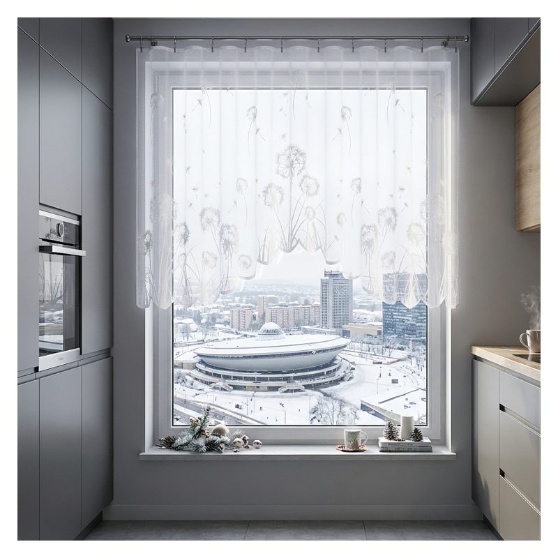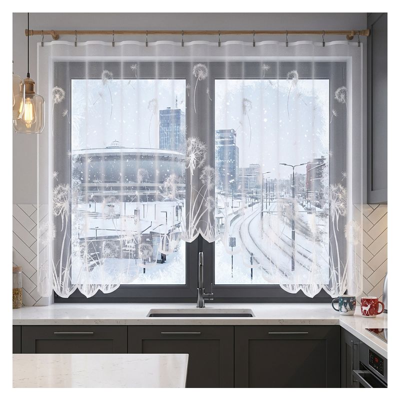 Zdobniczy motyw efektownych dmuchawców oraz finezyjny łuk w dolnej części firany dodają jej lekkości i nowoczesnego designu.