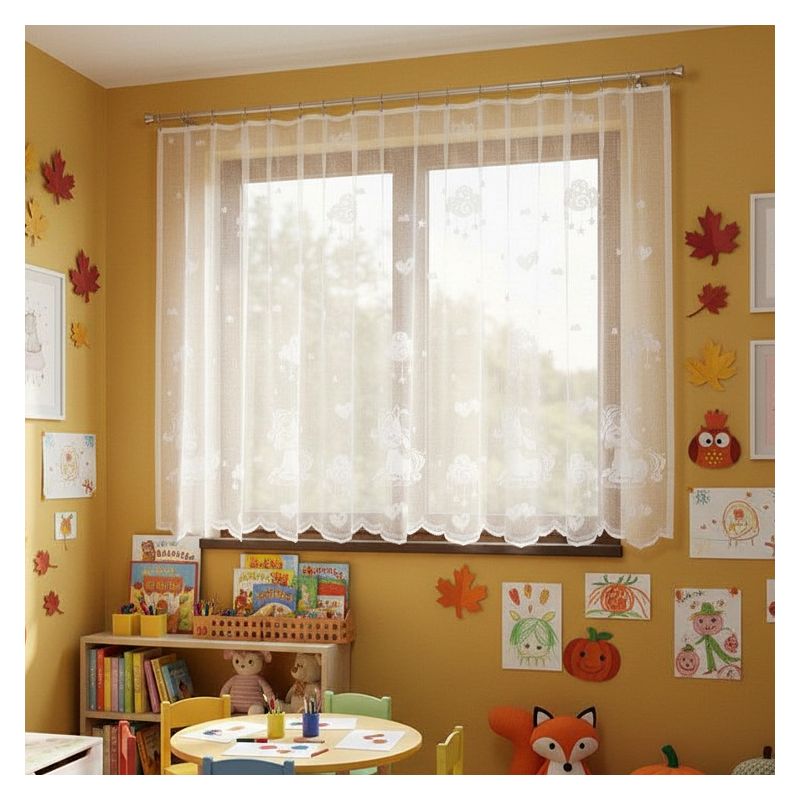 Dziecięca firanka Biały Jednorożec o wymiarach 220 x 120 cm to gotowa dekoracja okienna, która wprowadzi do pokoju każdej dziewczynki bajkową, magiczną atmosferę sprzyjającą wesołej zabawie.