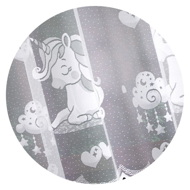 Gotowa firana oferowana jest w eleganckim białym kolorze i ozdobiona została uroczym motywem jednorożców.