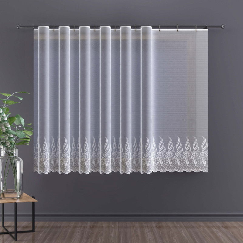 Dzięki wymiarom 400 x 150 cm, firanka z białego żakardu doskonale sprawdzi się jako modna ozdoba większości standardowych okien.