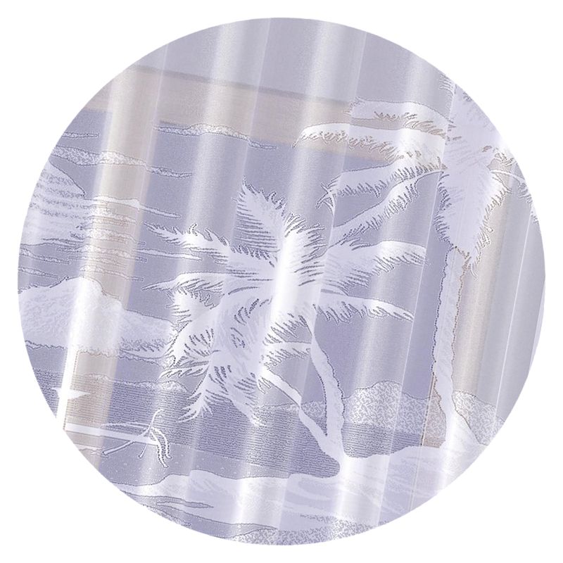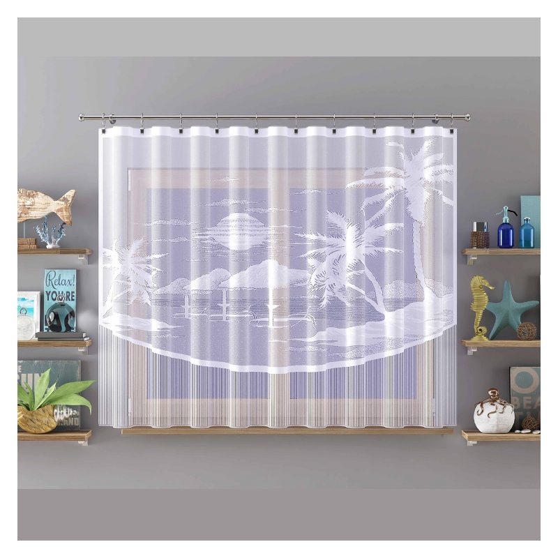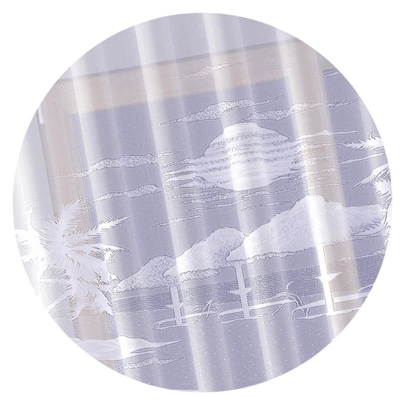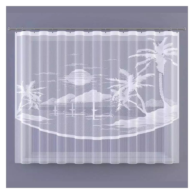 Żakardowa firana oferowana jest w klasycznym kolorze białym i zachwyci Cię swoim motywem egzotycznej plaży o zachodzie słońca.