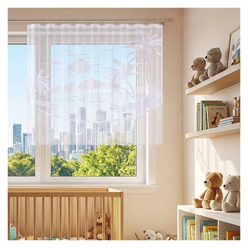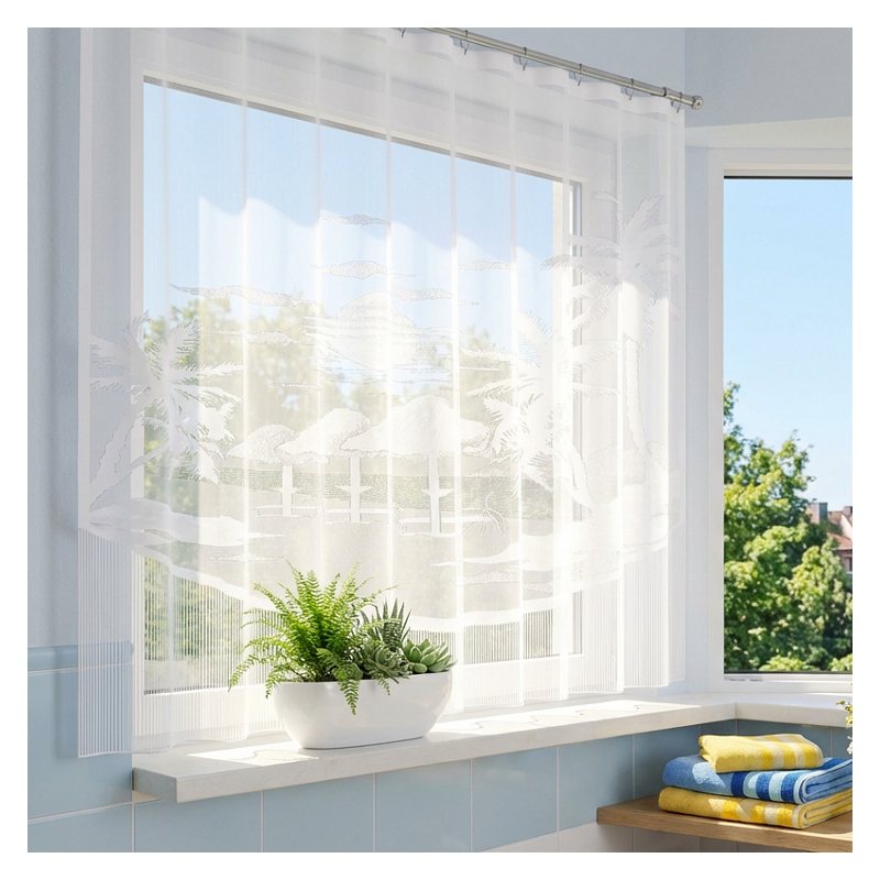 Zamów naszą gotową firankę z trwałego żakardu i przez wiele nadchodzących sezonów ciesz się atrakcyjnym widokiem egzotycznej plaży w swoim oknie.