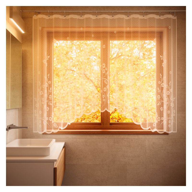 Kwiatowa firanka z białego żakardu ma szerokość 220 cm i wysokość 120 cm, dzięki czemu świetnie sprawdzi się w Twoim salonie, pokoju gościnnym lub dziennym, sypialni, łazience, jadalni oraz kuchni.