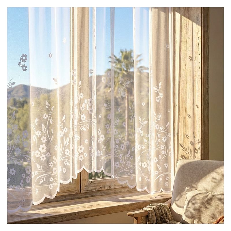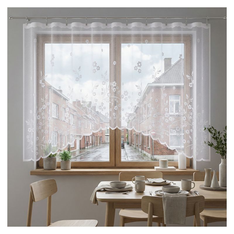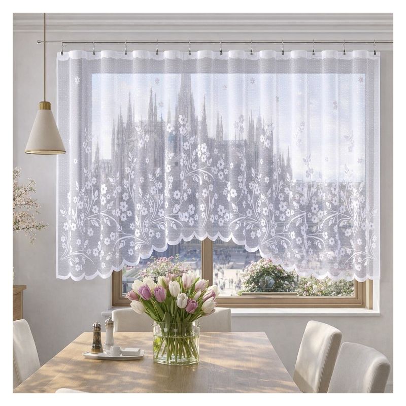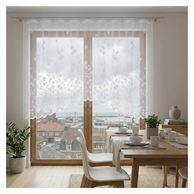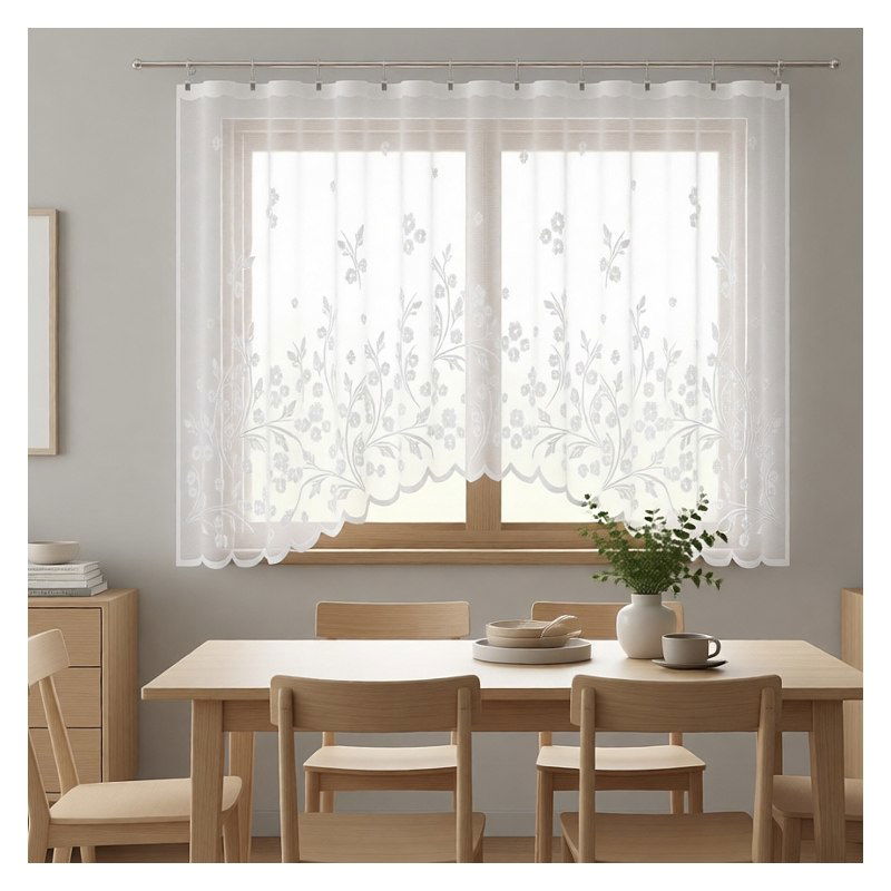 Uniwersalny biały kolor kwiatowej firany wprowadzi do każdego Twojego pomieszczenia jasność, poczucie świeżości i optycznie powiększy jego wnętrze.