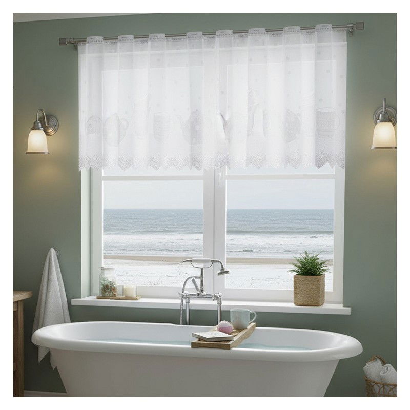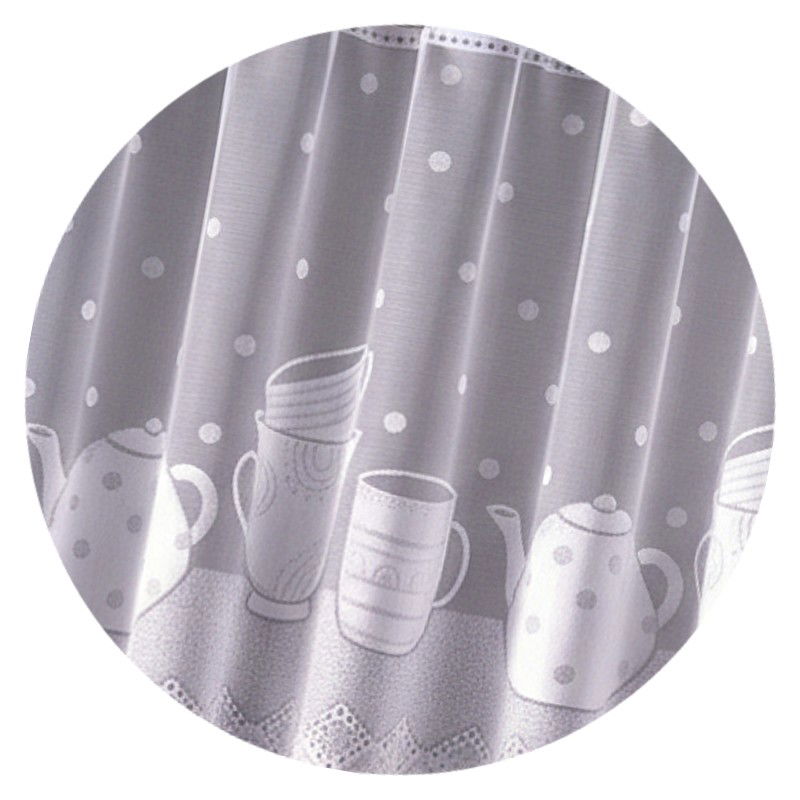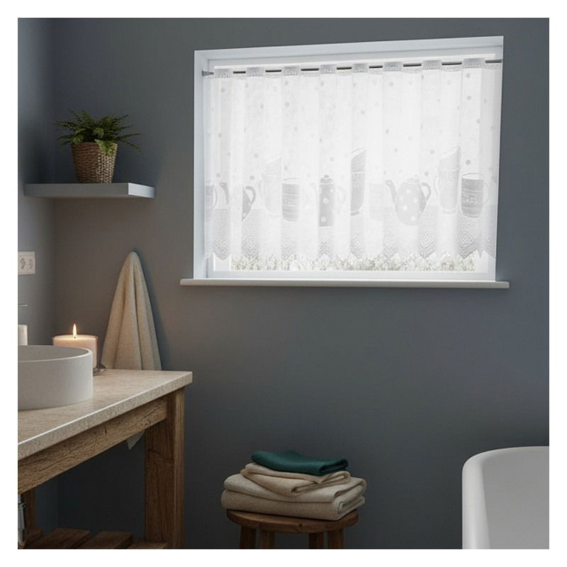 Metrażowa firana Dzbanki w wysokości 70 cm to nowoczesna dekoracja okienna dostępna w eleganckiej białej kolorystyce.
