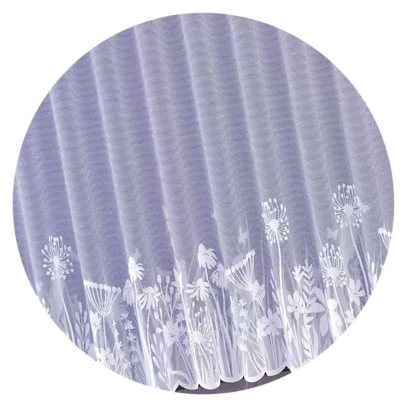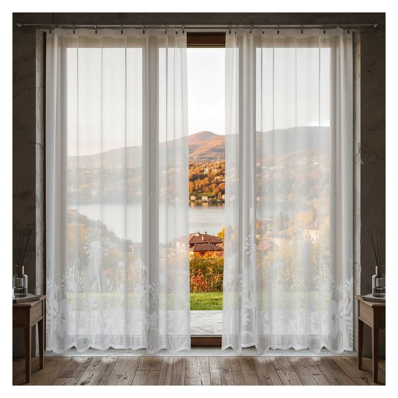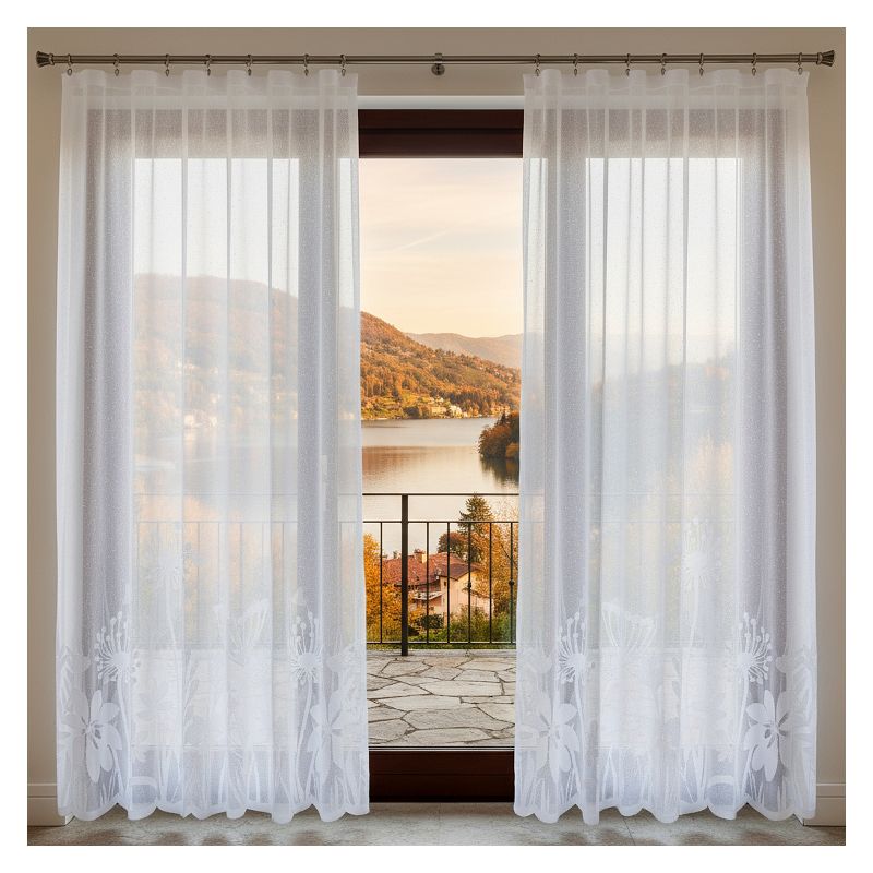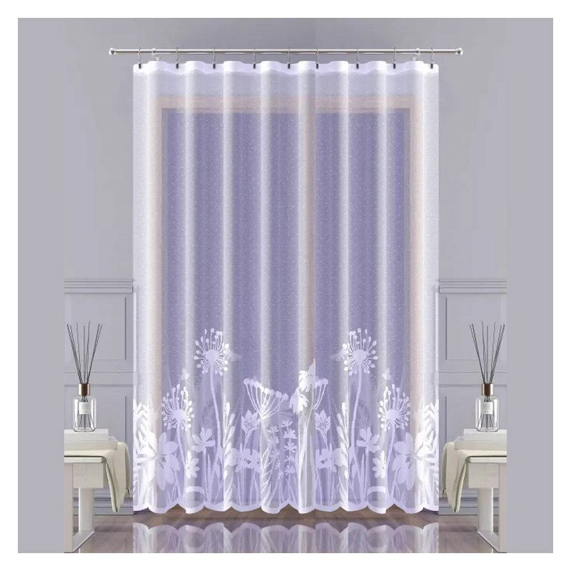 Firana żakardowa Ennet przyciąga wzrok zarówno swoją elegancką białą kolorystyką, jak i dekoracyjnym roślinno-kwiatowym pasem zdobiącym dolną jej część.