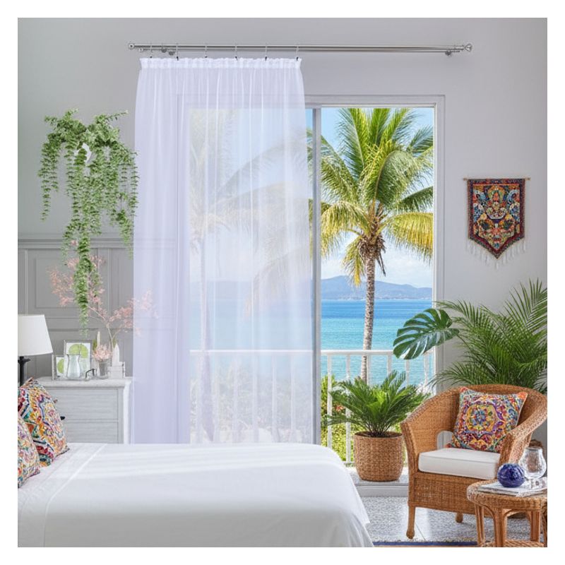 Zawieszenie w wysokim oknie naszej eleganckiej dekoracji z białego woalu wprowadzi do wnętrza Twojego mieszkania lub domu atmosferę spokoju i relaksu.