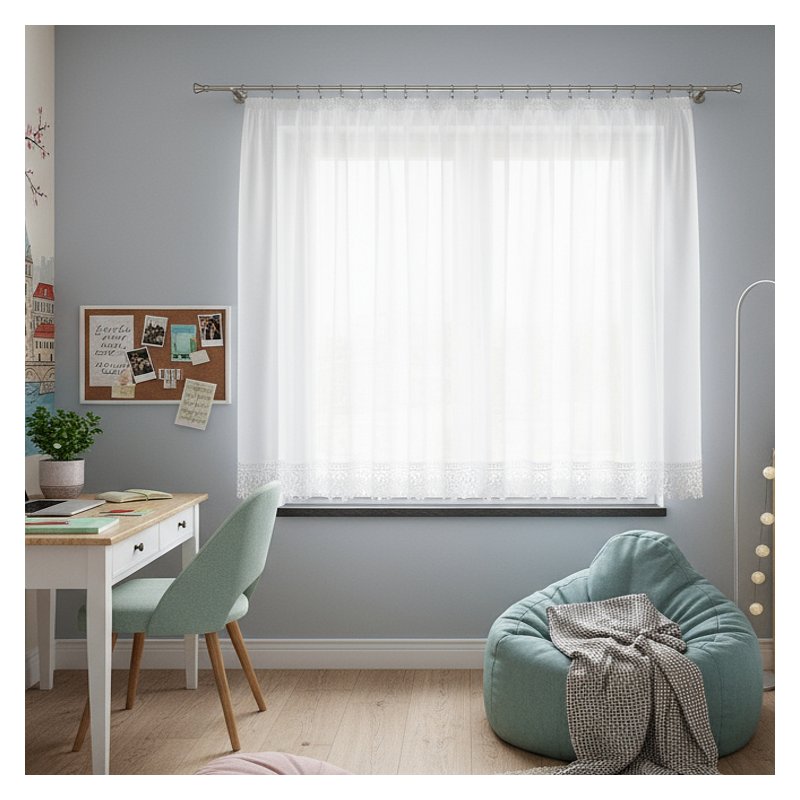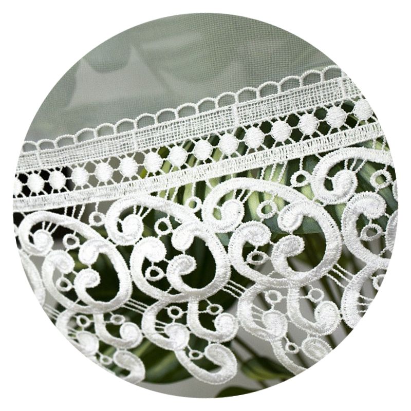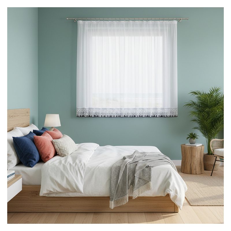 Okienna dekoracja z eleganckiego woalu w dolnej części wykończona jest bawełnianą gipiurą - nasza modna firana zawieszona w Twoim oknie przyciągnie uwagę domowników i gości odwiedzających Twój dom.