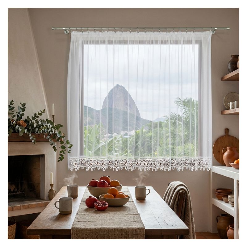 Okienna ozdoba z eleganckiego woalu w dolnej części wykończona jest bawełnianą gipiurą - nasza urokliwa firana zawieszona w Twoim oknie przyciągnie uwagę domowników i gości odwiedzających Twój dom.