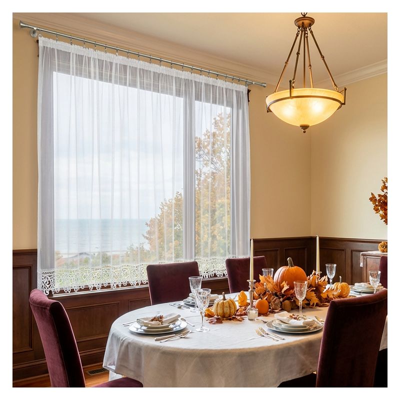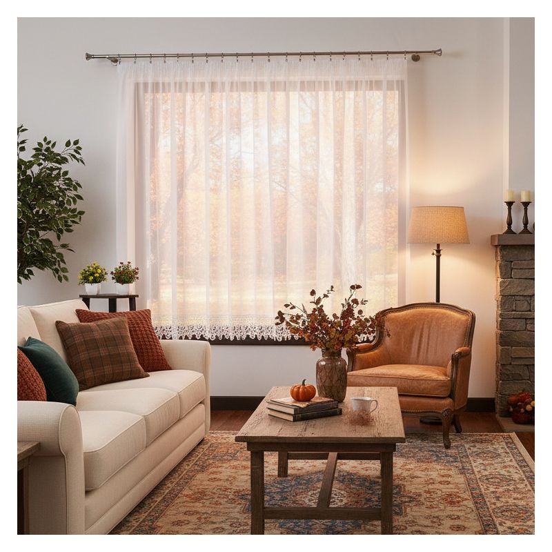 Elegancka okienna ozdoba z białego woalu bezproblemowo dopasuje się do różnorodnych aranżacji wykończenia wnętrz.