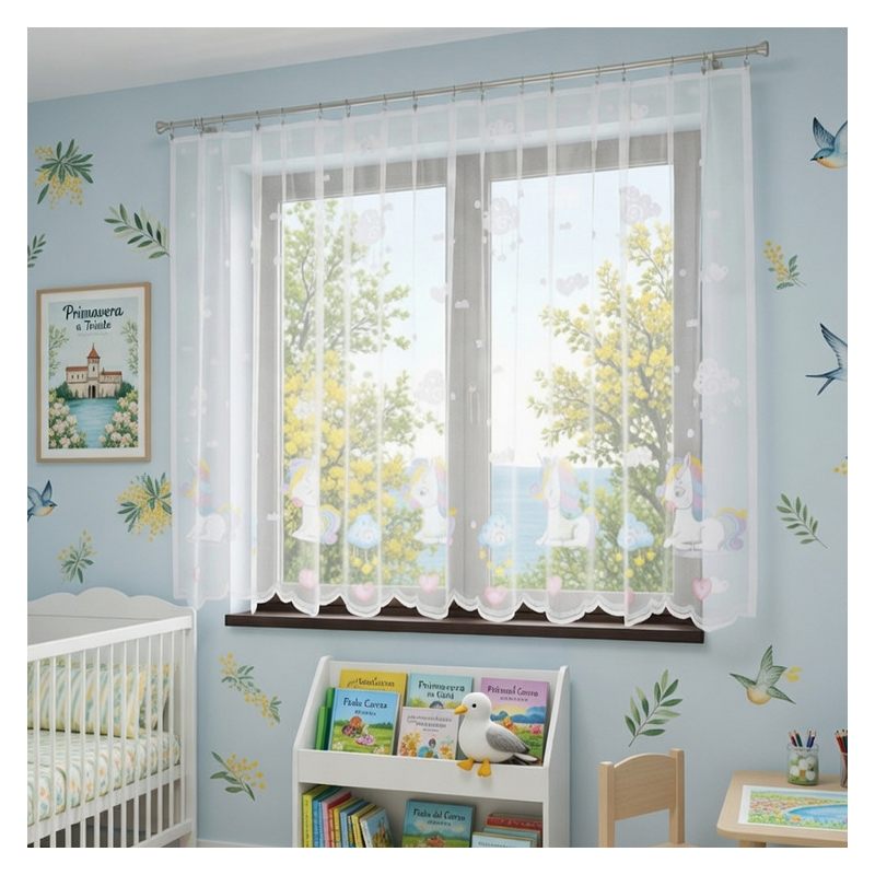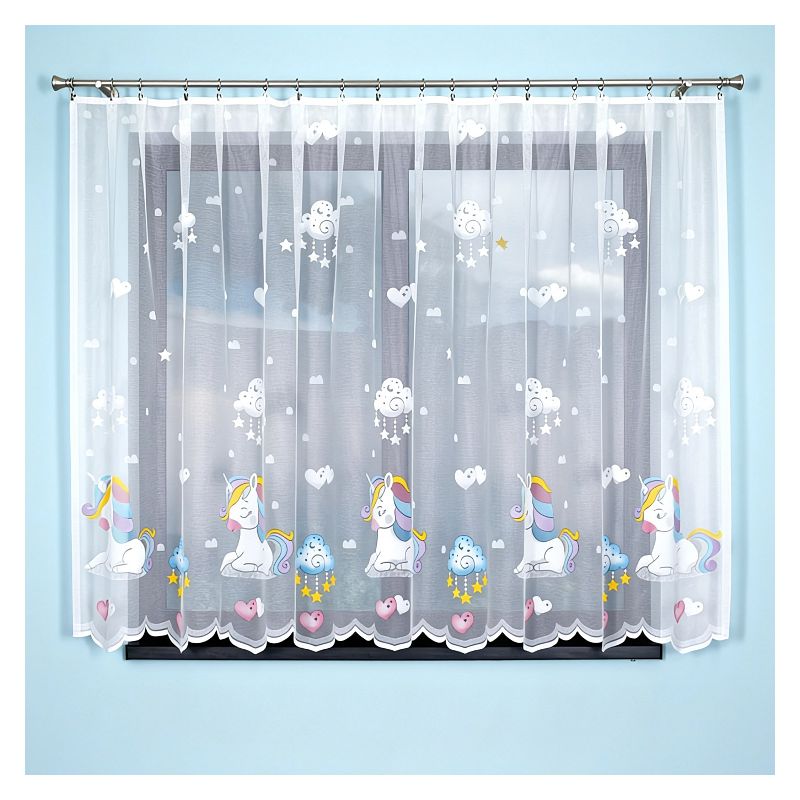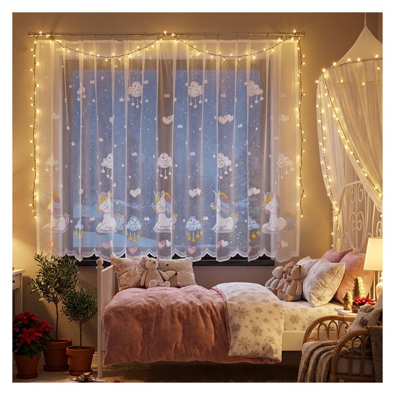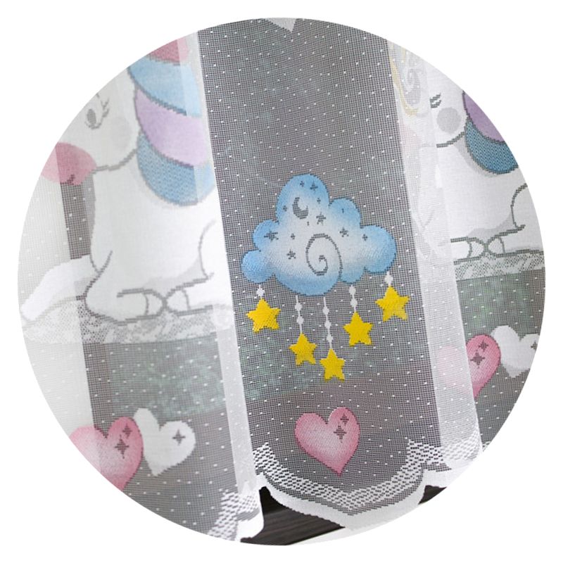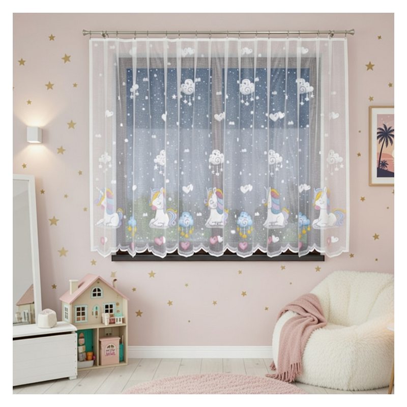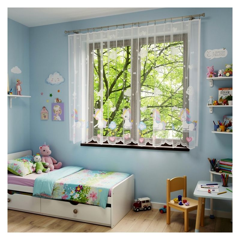 Gotowa firana Kolorowy Jednorożec w rozmiarze 300 x 150 cm to dziecięca ozdoba okienna, która wprowadzi do pokoju każdej dziewczynki magiczną atmosferę sprzyjającą aktywnej zabawie.