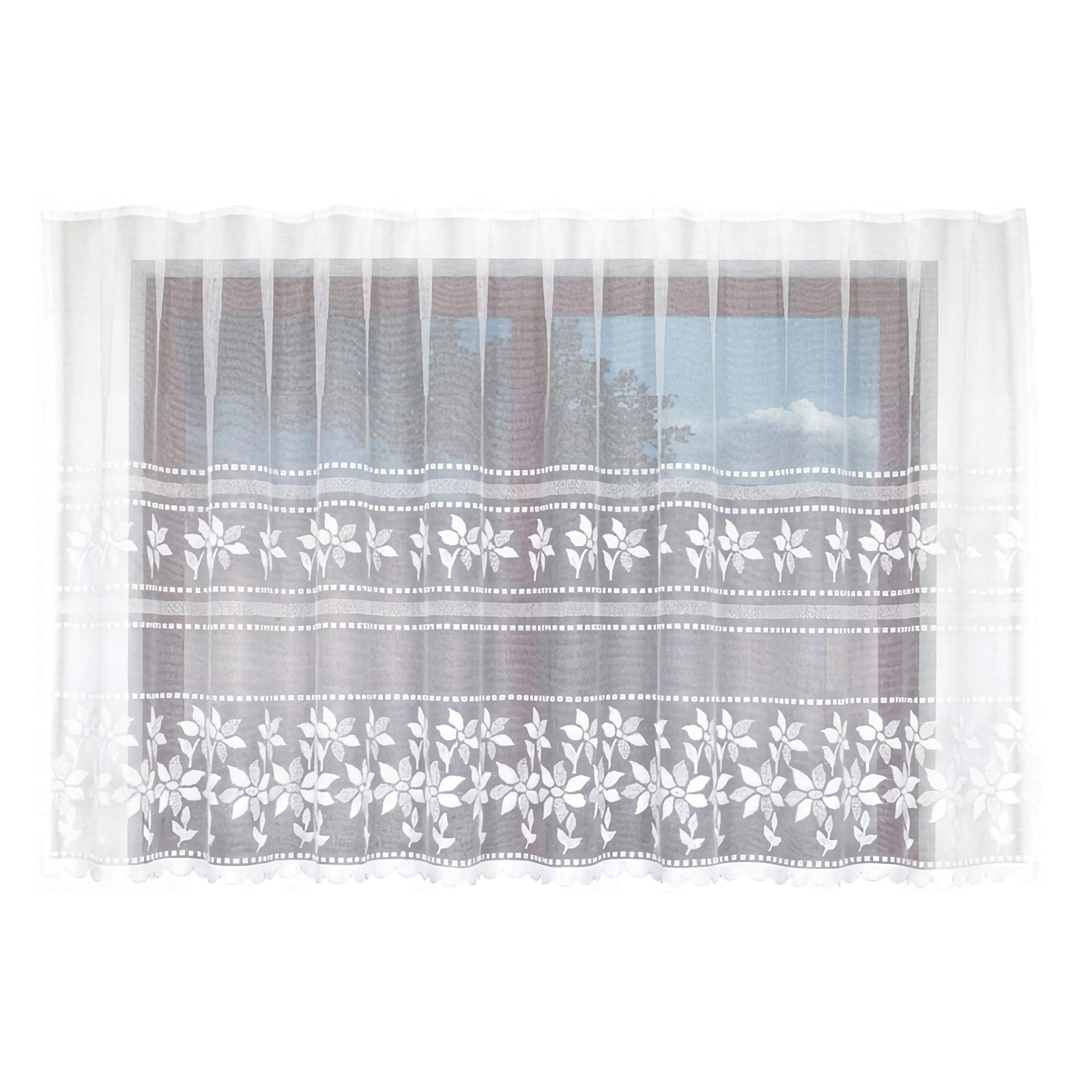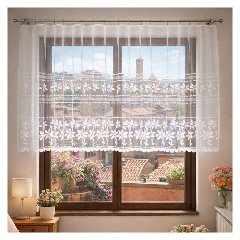 Nasza gotowa ozdoba okienna z białego żakardu na długi okres czasu zapewni elegancki wystrój każdego pomieszczenia, w którym ją zawiesisz.