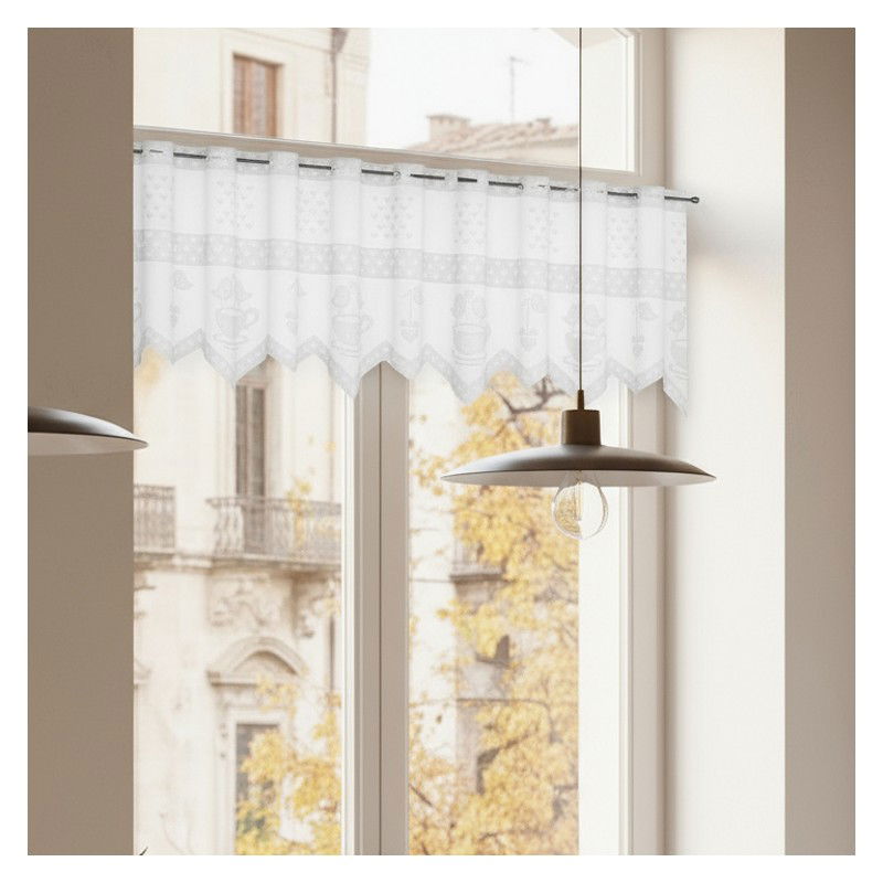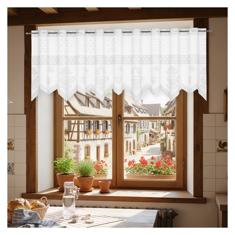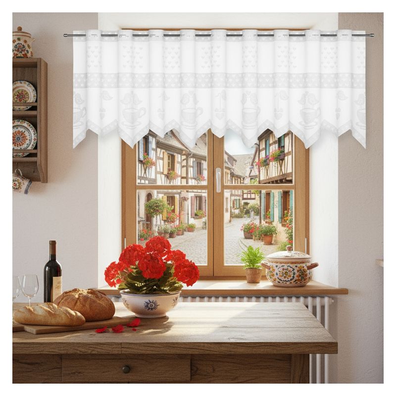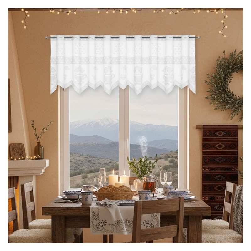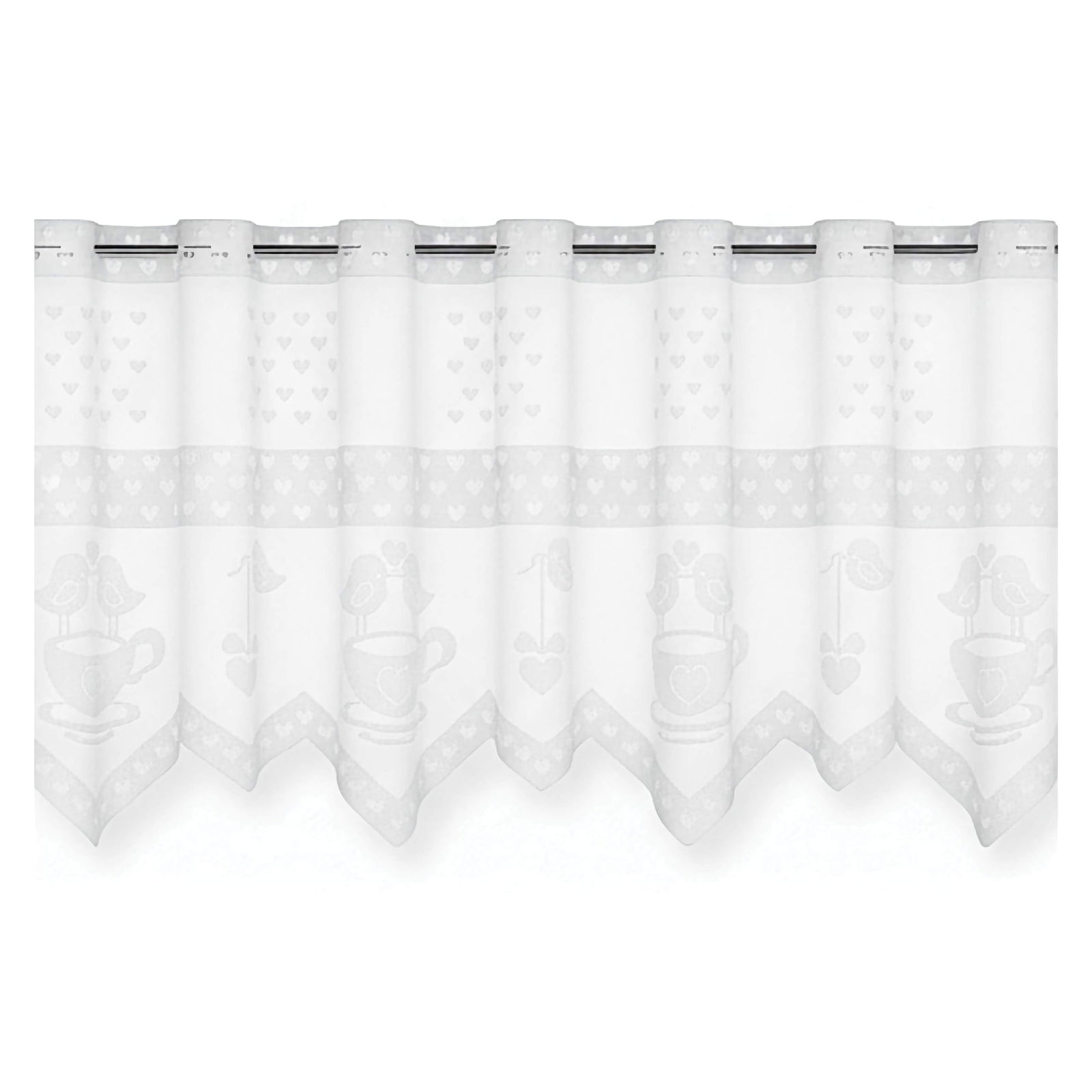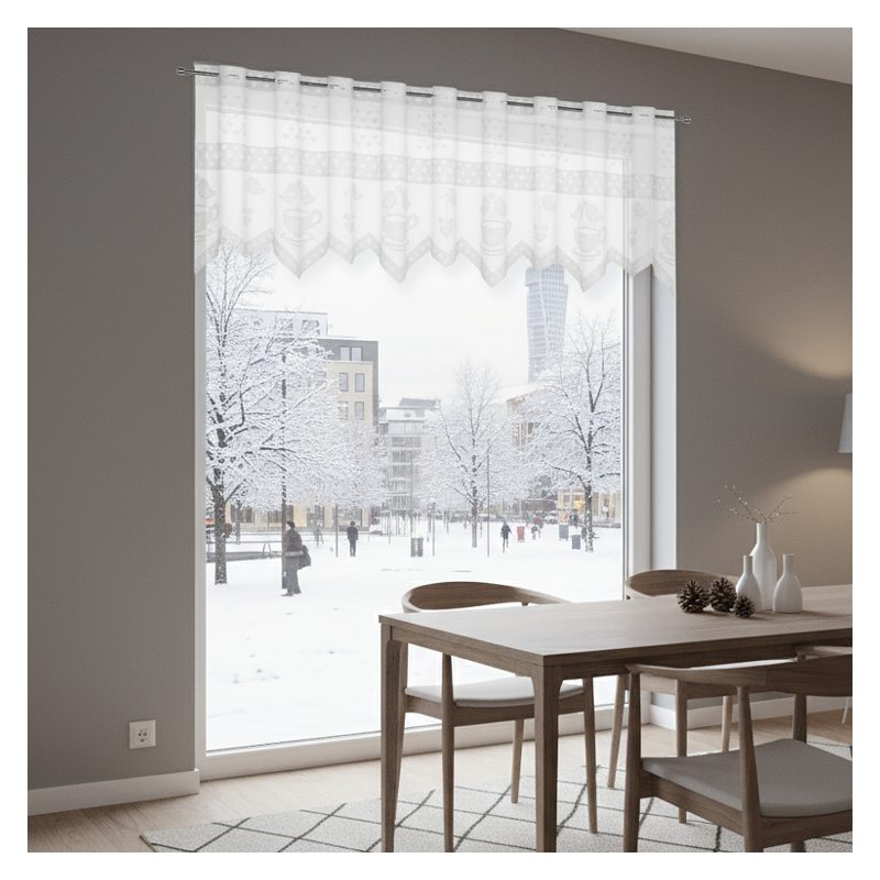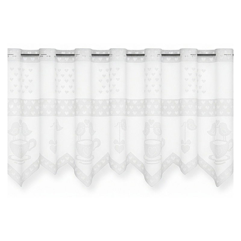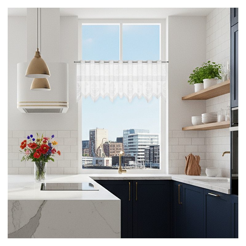 Metrażowa firanka z białego żakardu w wysokości 50 cm może być wykorzystana również jako lambrekin lub zazdrostka, dodając atrakcyjnego wyglądu Twojemu oknu.