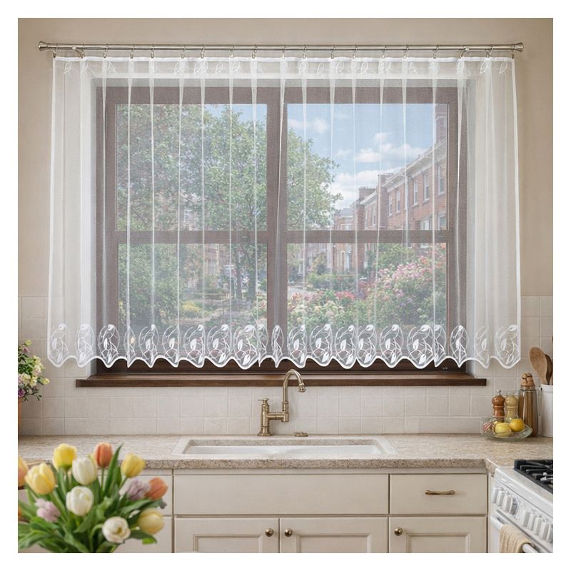 Modna firanka z białego żakardu Minisa o wymiarach 300 x 130 cm to nie tylko urokliwa ozdoba okna - to również sposób na stworzenie przyjemnej atmosfery w Twoim domu.
