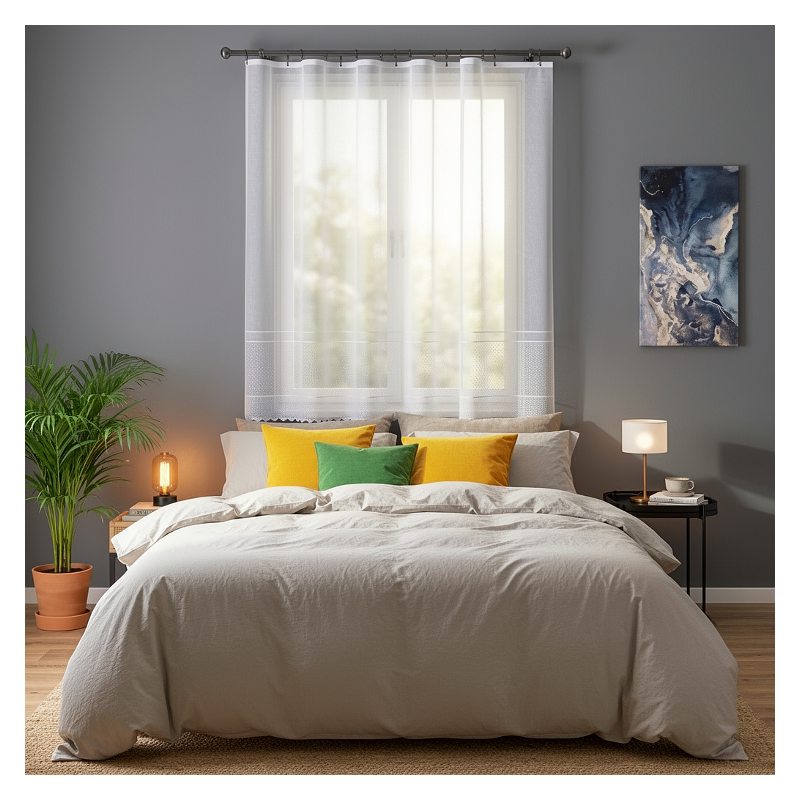 Biały kolor firanki Moza doskonale współgra z różnymi aranżacjami wnętrz. Bez względu na kolor ścian czy mebli, biała okienna dekoracja podkreśli ich wyrazistość, dodając wnętrzu jasności i elegancji.