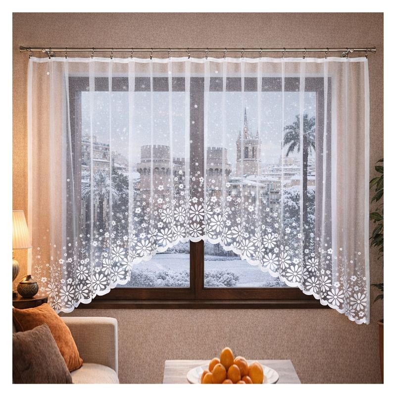 Biała żakardowa dekoracja z urokliwym kwiatowym wzorem to doskonały wybór dla tych, którzy chcą stworzyć w domowym zaciszu harmonijną i przytulną atmosferę, jednocześnie na wiele sezonów zapewniając sobie wysokiej jakości okienną aranżację.