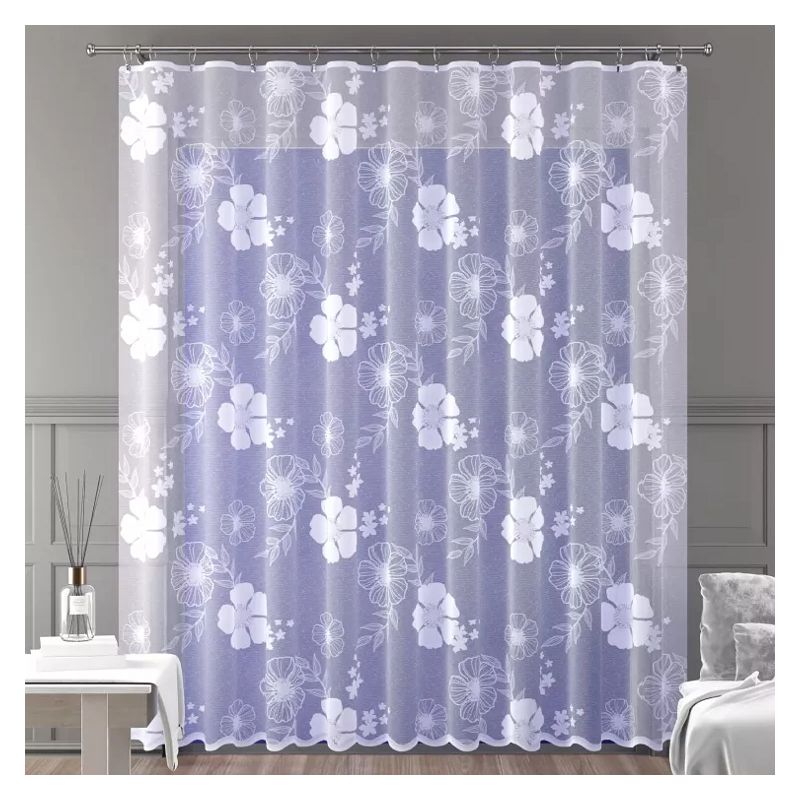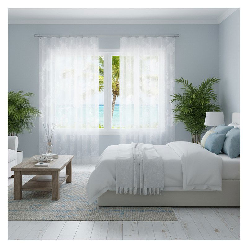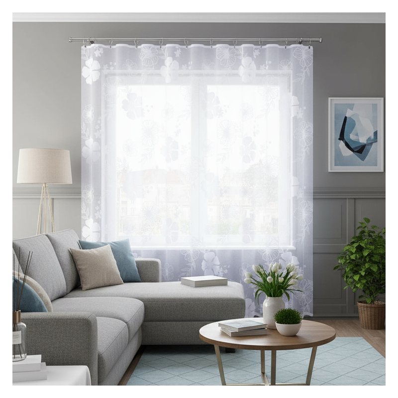 Długa firana z kwiatowym wzorem zdobniczym to doskonały wybór dla wszystkich, którzy pragną wprowadzić do swoich pomieszczeń modny akcent dekoracyjny.