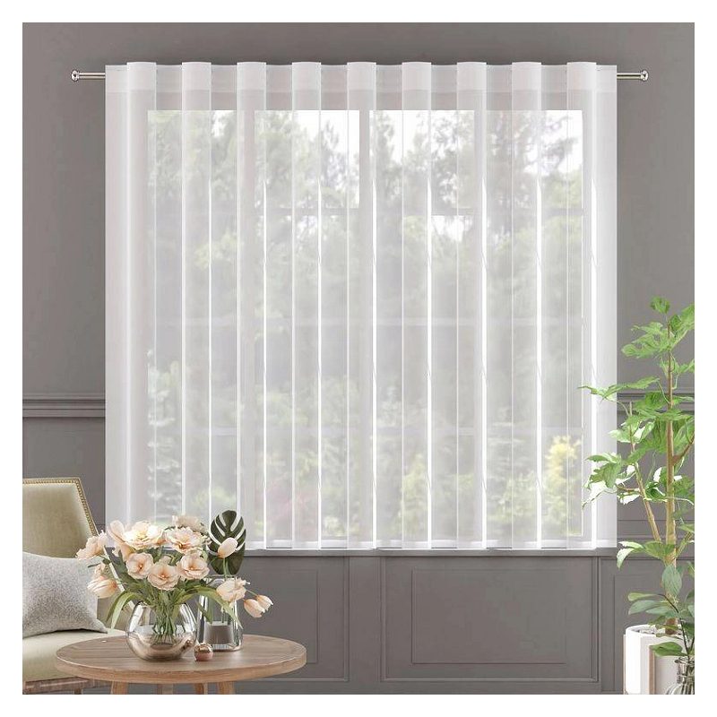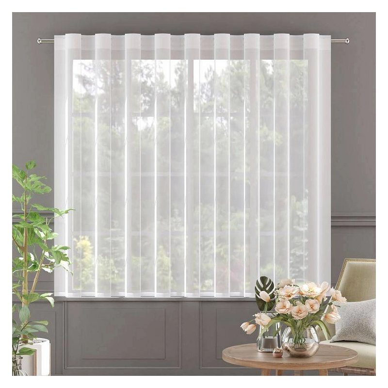 Woalowa firana na całej swojej powierzchni ozdobiona jest estetycznymi paskami - to doskonała biała dekoracja zarówno do tradycyjnych, jak i nowoczesnych aranżacji wnętrz.