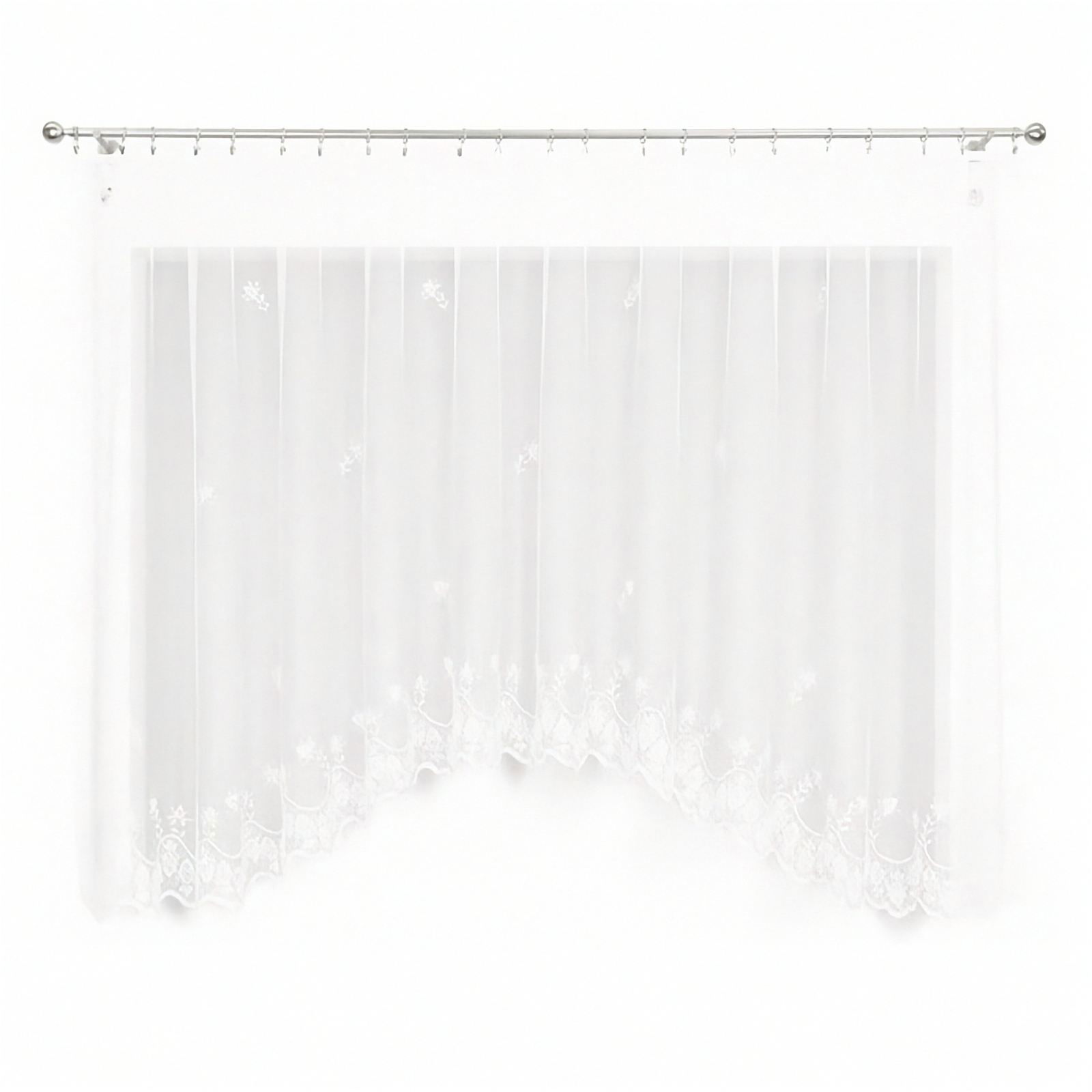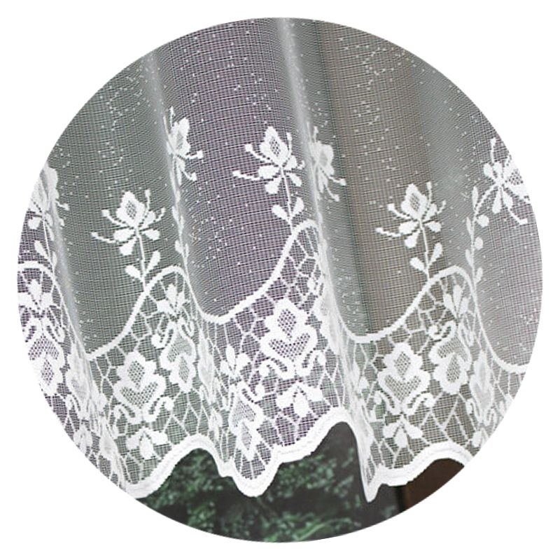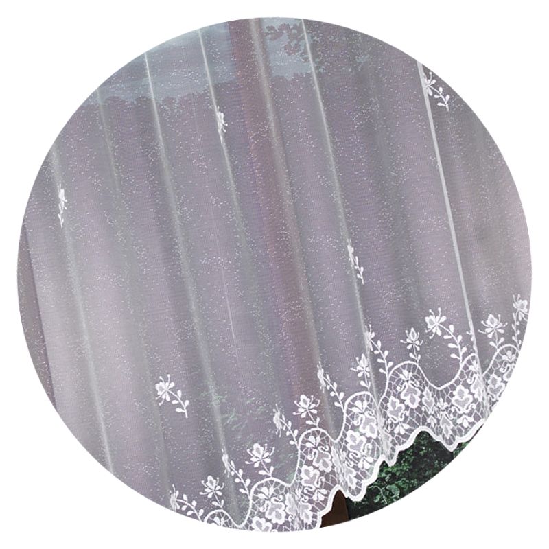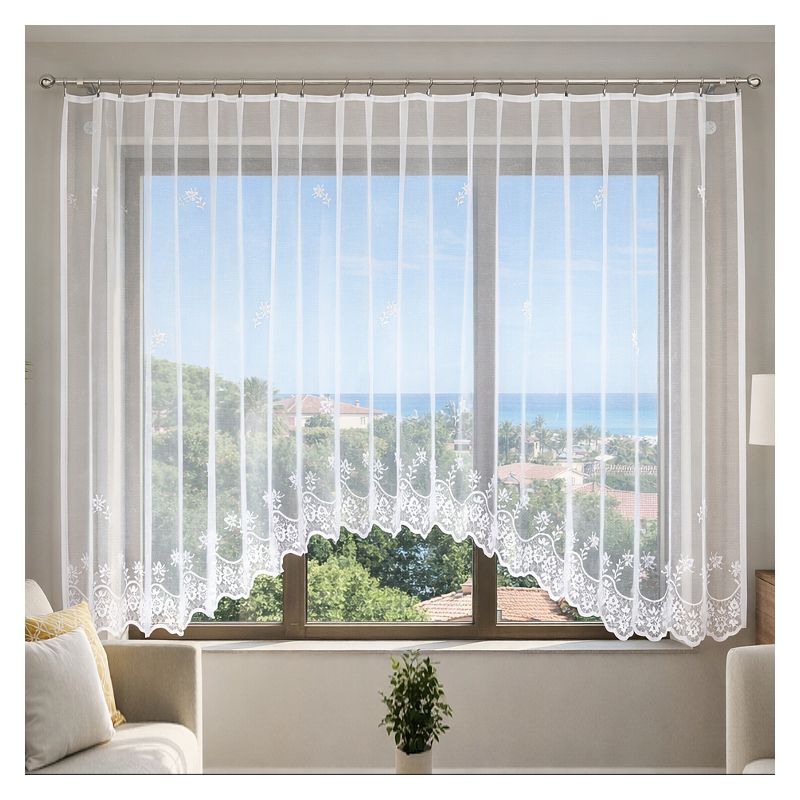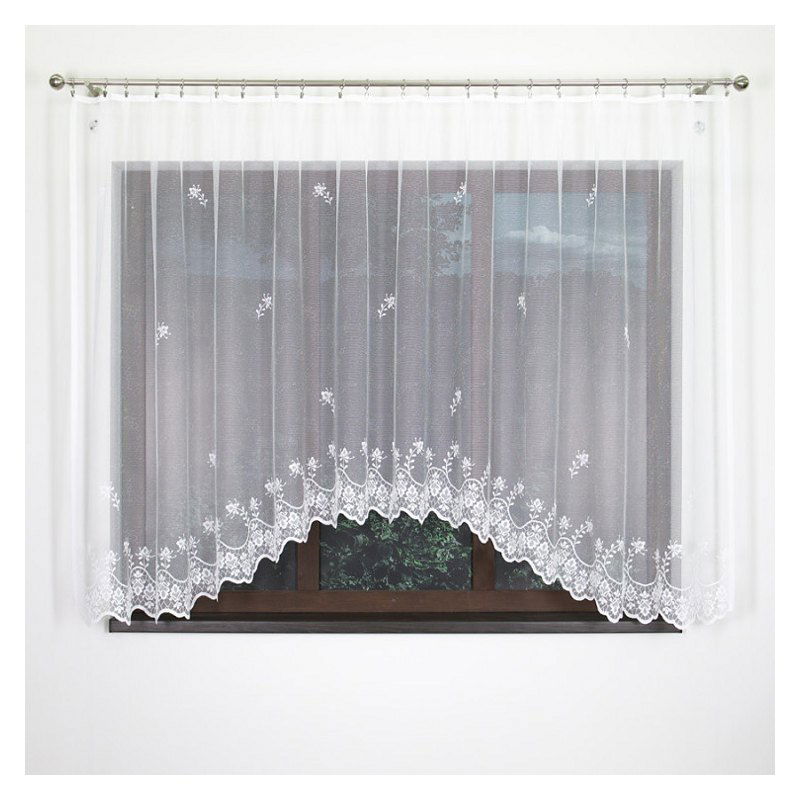 Gotowa firanka z białego żakardu upiększona została ponadczasowym motywem kwiatowym.