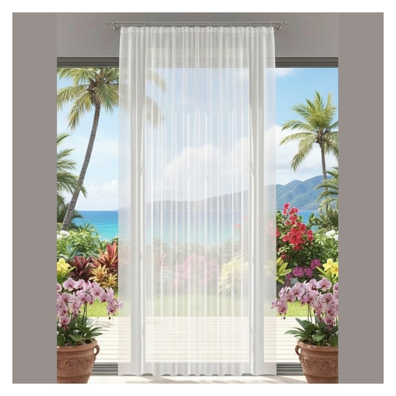 Biała woalowa firana na długi okres czasu stanie się piękną ozdobą każdego wysokiego okna, w którym ją zawiesisz.