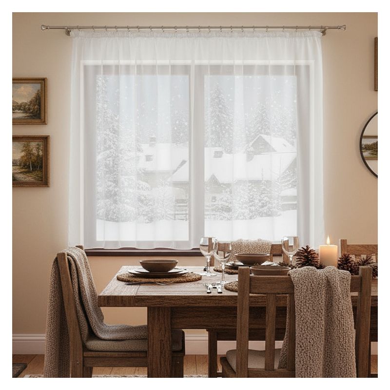 Nasza biała gotowa dekoracja z wysokiej jakości woalu to doskonały wybór dla tych, którzy chcą stworzyć w domowym zaciszu harmonijną i przytulną atmosferę, jednocześnie na wiele sezonów zapewniając sobie atrakcyjną aranżację swojego okna.