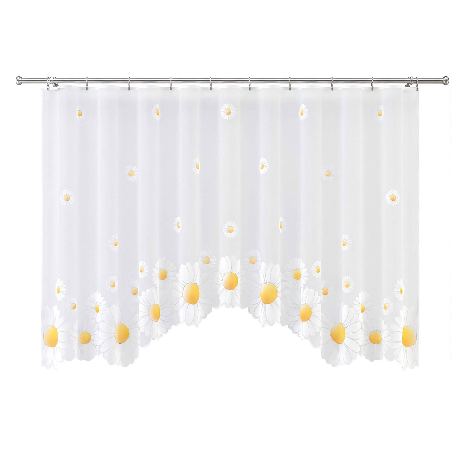 Gotowa firana Stokrotka wyprodukowana została z modnego żakardu - łączy w sobie nowoczesny wygląd z estetyką i trwałością wysokiej jakości żakardowego materiału.