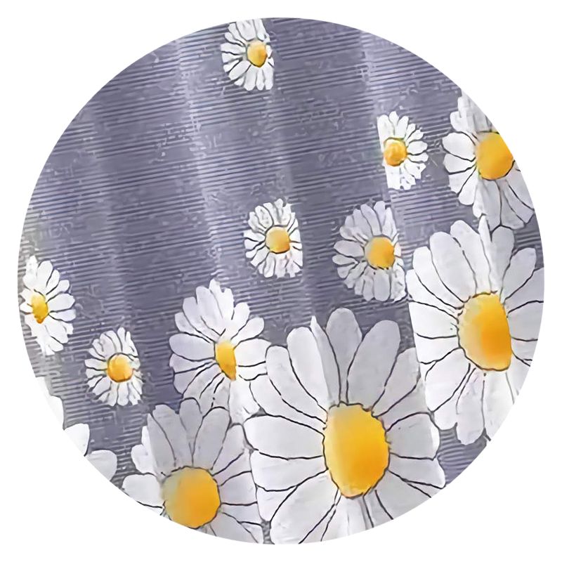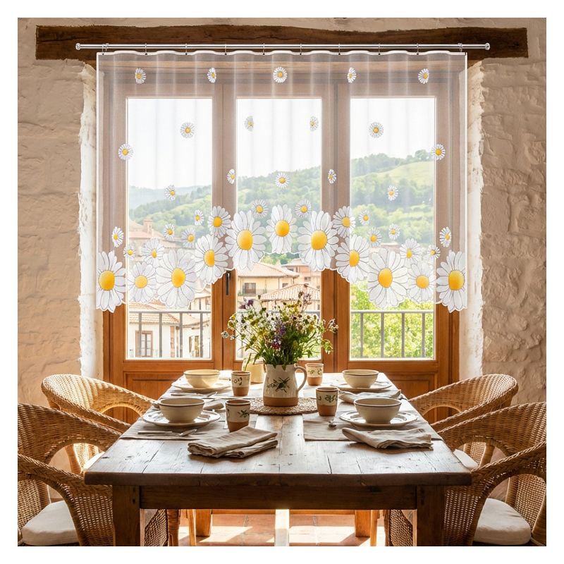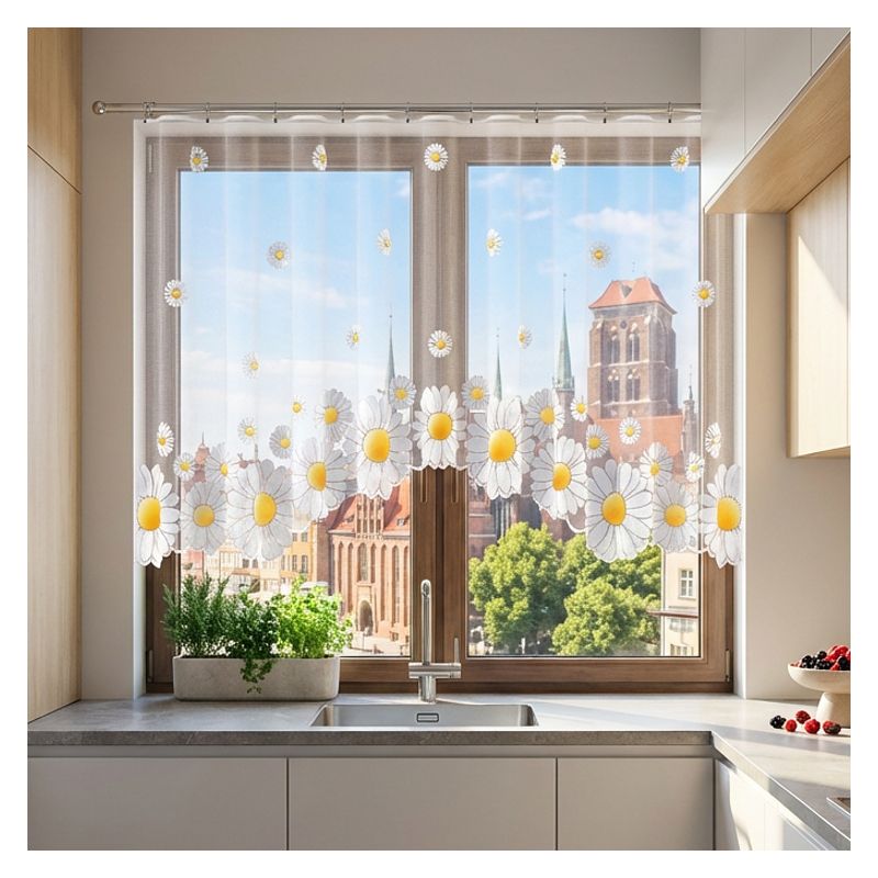 Firanka Stokrotka o wymiarach 300 x 150 cm to gotowa ozdoba okienna, która przyciąga wzrok swoją elegancką, białą kolorystykę i efektownym motywem kolorowych kwiatów stokrotek.