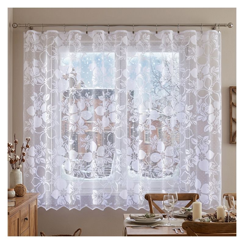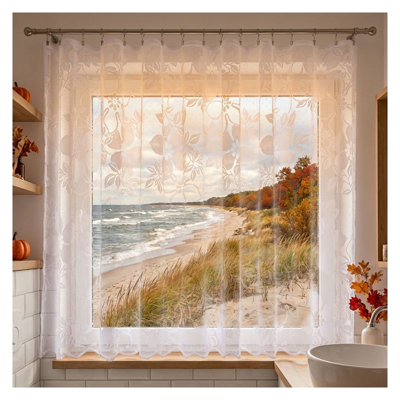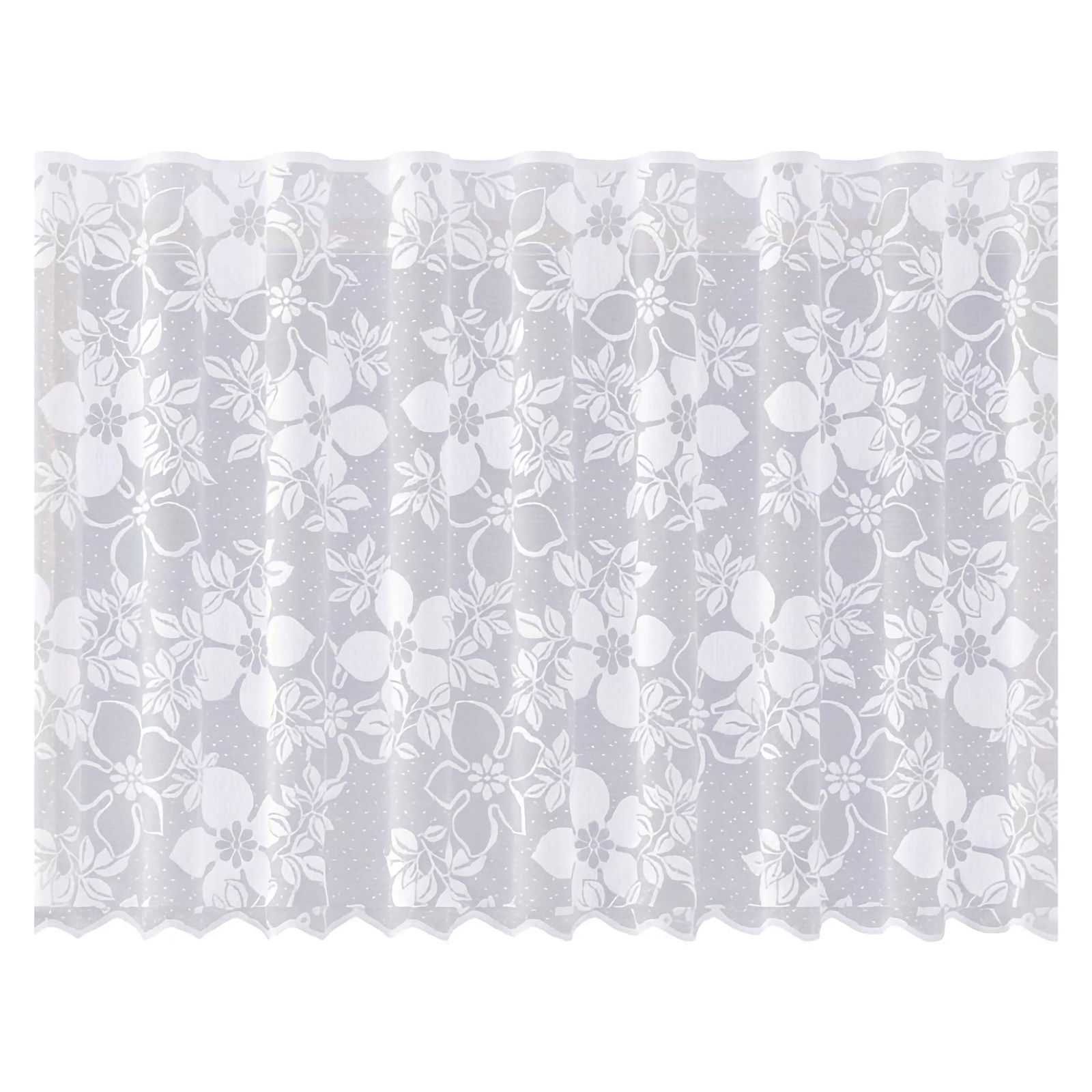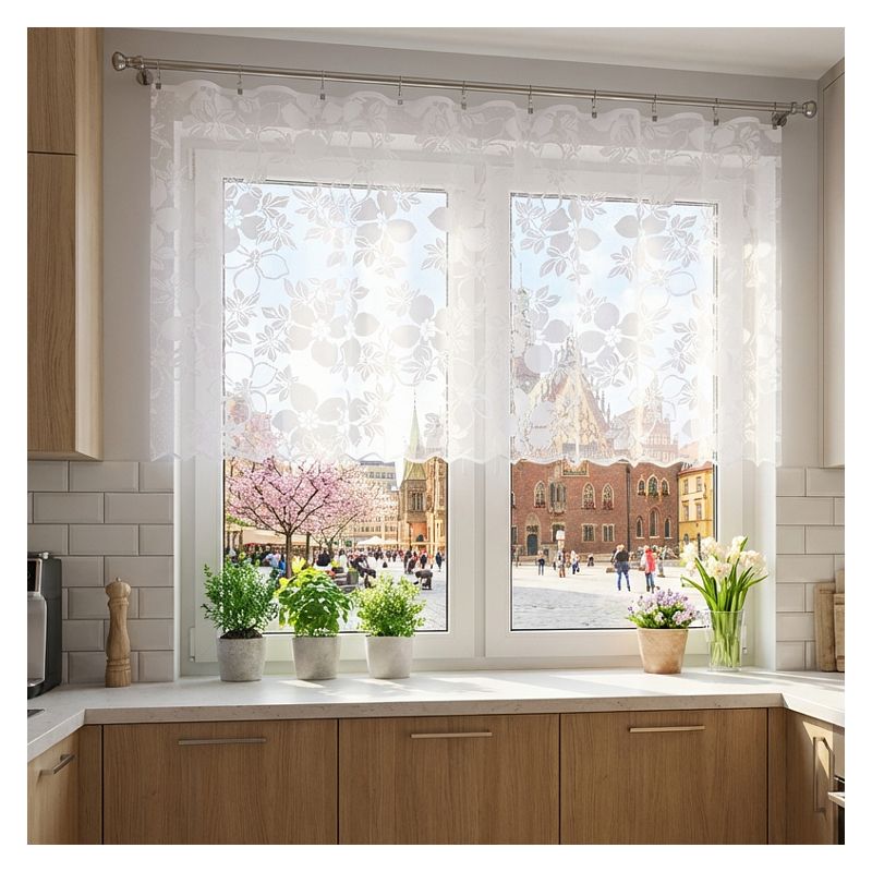 Wysoka jakość, biała kolorystyka oraz atrakcyjny kwiatowy motyw sprawiają, że żakardowa dekoracja będzie piękną ozdobą Twojego okna przez długie lata.