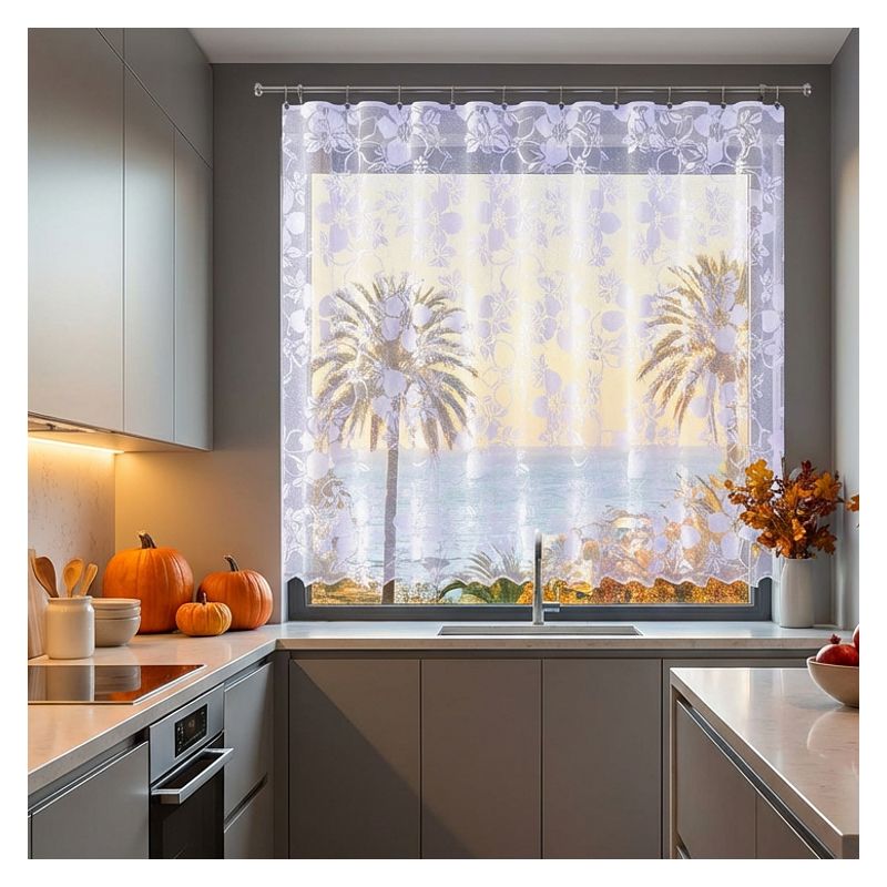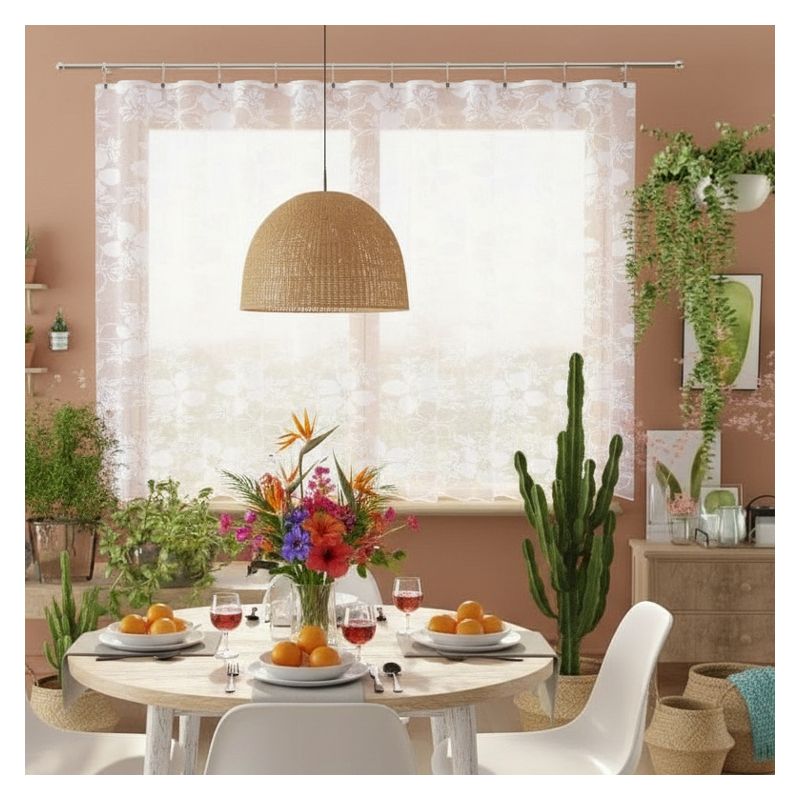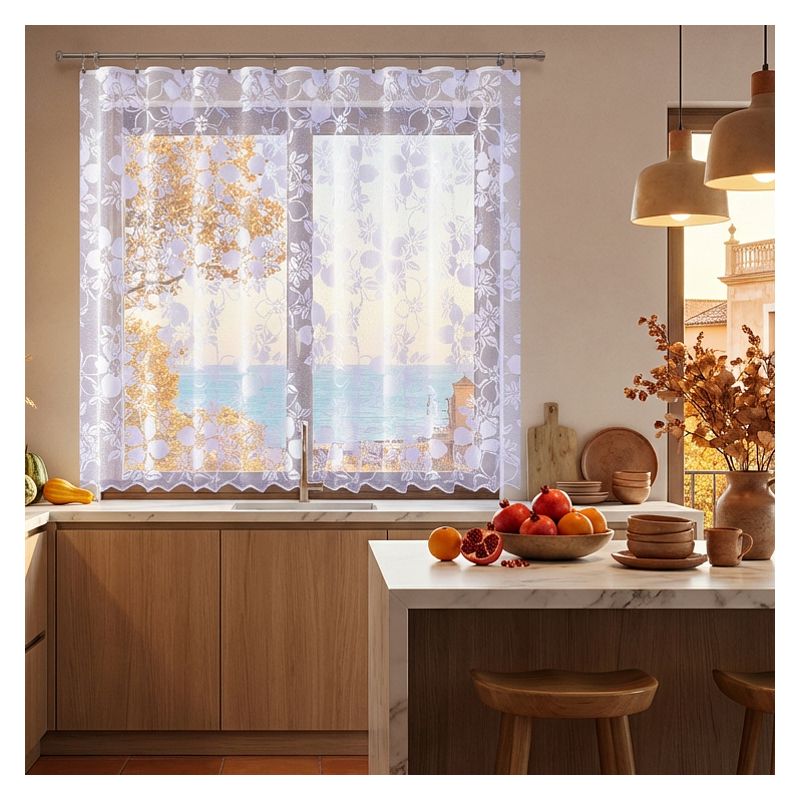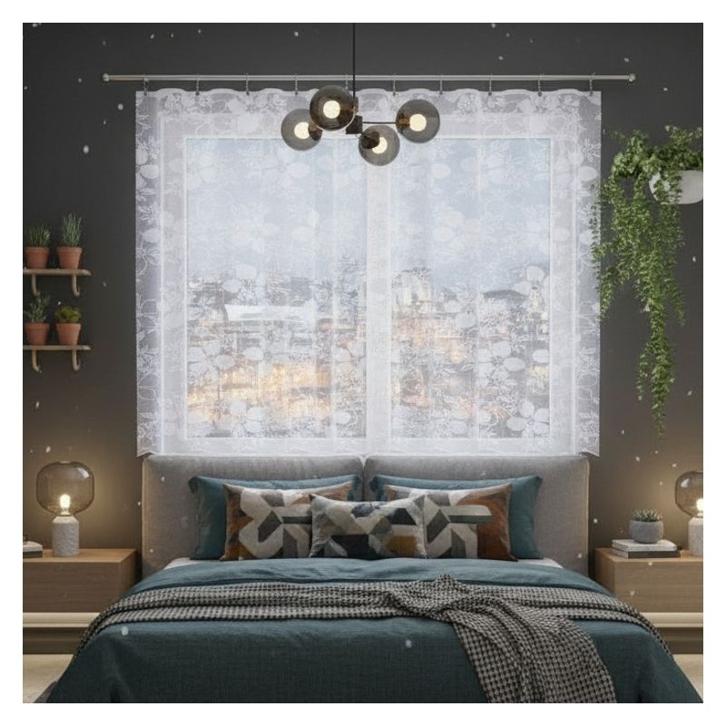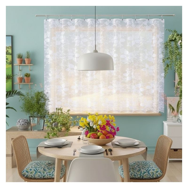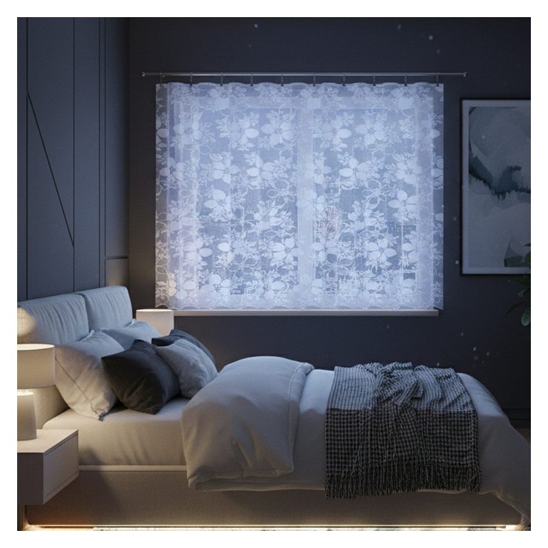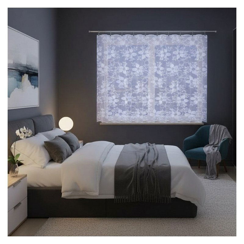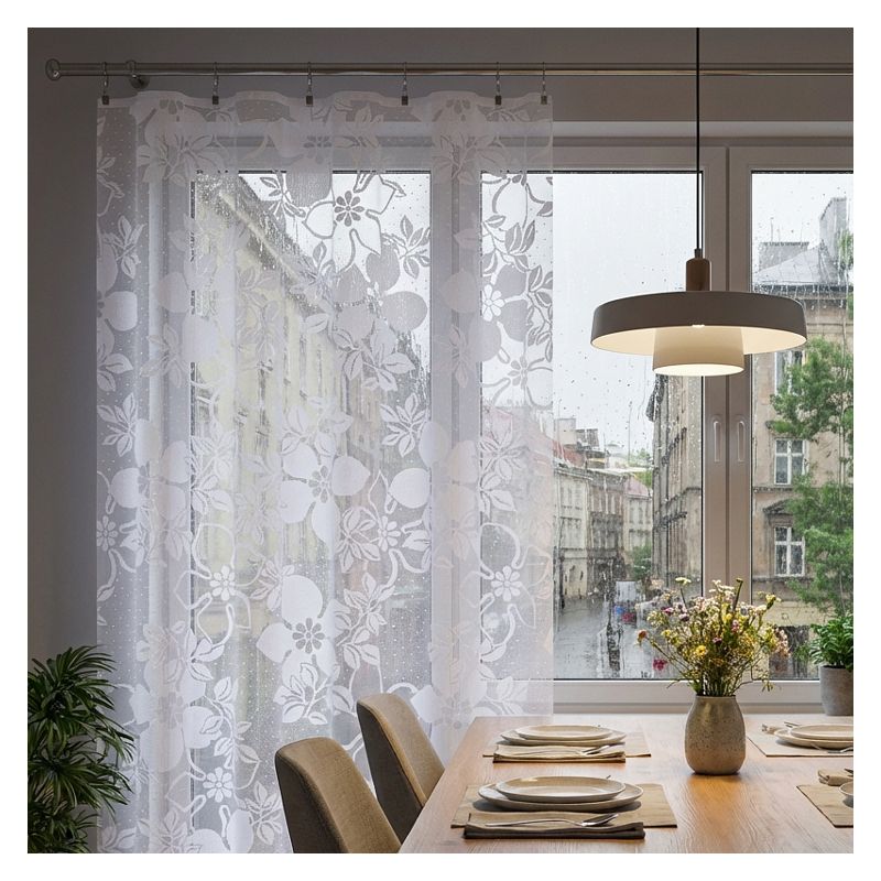 Kwiatowy wzór w połączeniu z elegancką białą kolorystyką sprawiają, że metrażowa firana doskonale komponuje się z różnorodnymi stylami wykończenia wnętrz, od klasycznych po nowoczesne.